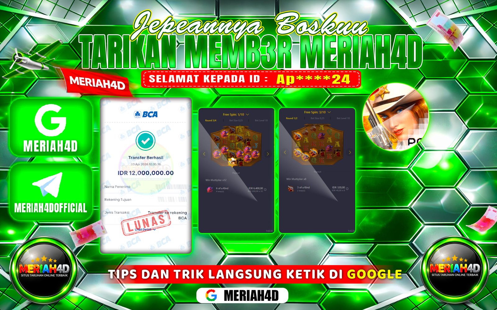 Selamat Kepada ID : Ap****24 Atas Withdraw Rp. 12.000.000 Juta Hari ini. Ditunggu Withdraw Selanjutnya dan ajak juga teman temannya bergabung di Meriah4d
