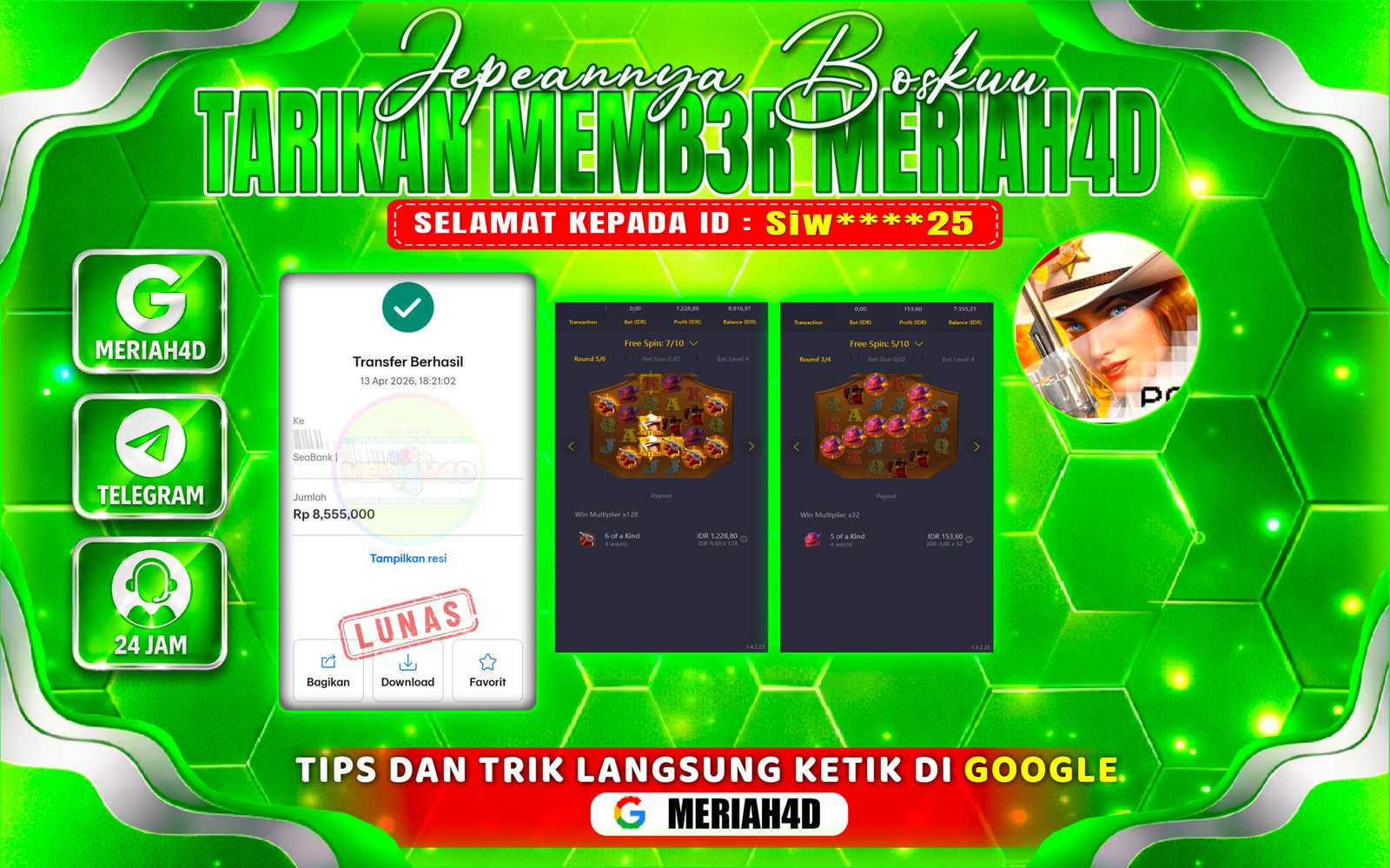 Selamat Kepada ID :Siw****25 Atas Withdraw Rp. 8.555.000 Juta Hari ini. Ditunggu Withdraw Selanjutnya dan ajak juga teman temannya bergabung di Meriah4d