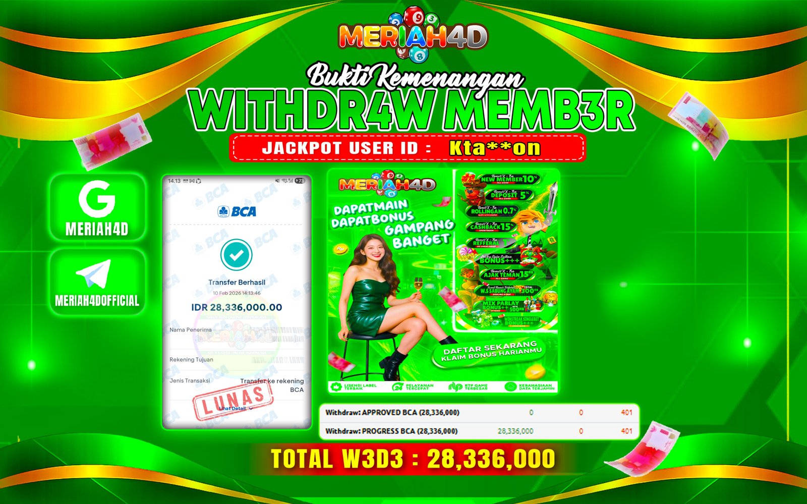 Selamat Kepada ID : KTA**ON Atas Withdraw Rp.28.336.000 Juta Hari ini. Ditunggu Withdraw Selanjutnya dan ajak juga teman temannya bergabung di Meriah4d