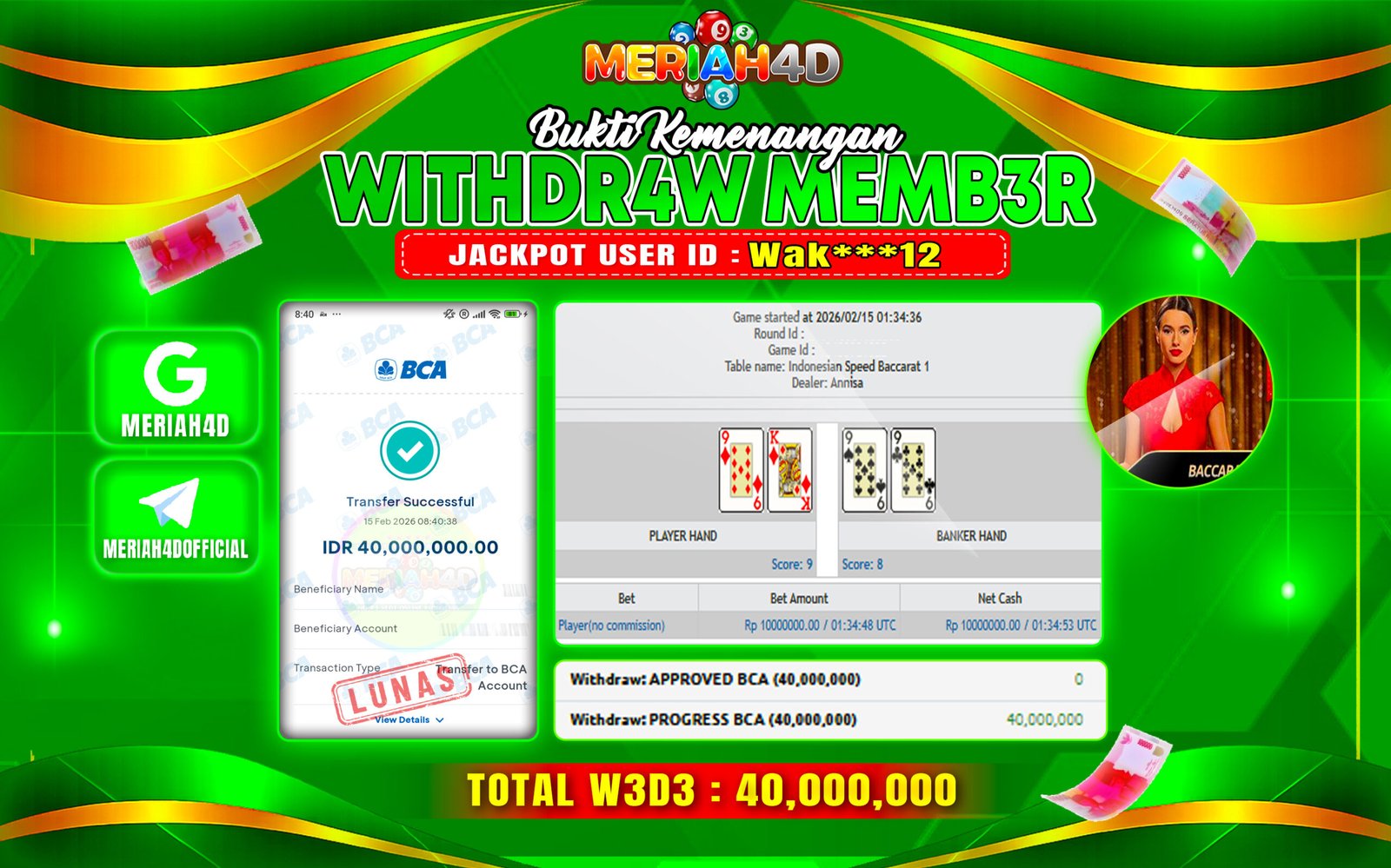 Selamat Kepada ID : WAK***12 Atas Withdraw Rp. 40.000.000 Juta Hari ini. Ditunggu Withdraw Selanjutnya dan ajak juga teman temannya bergabung di Meriah4d