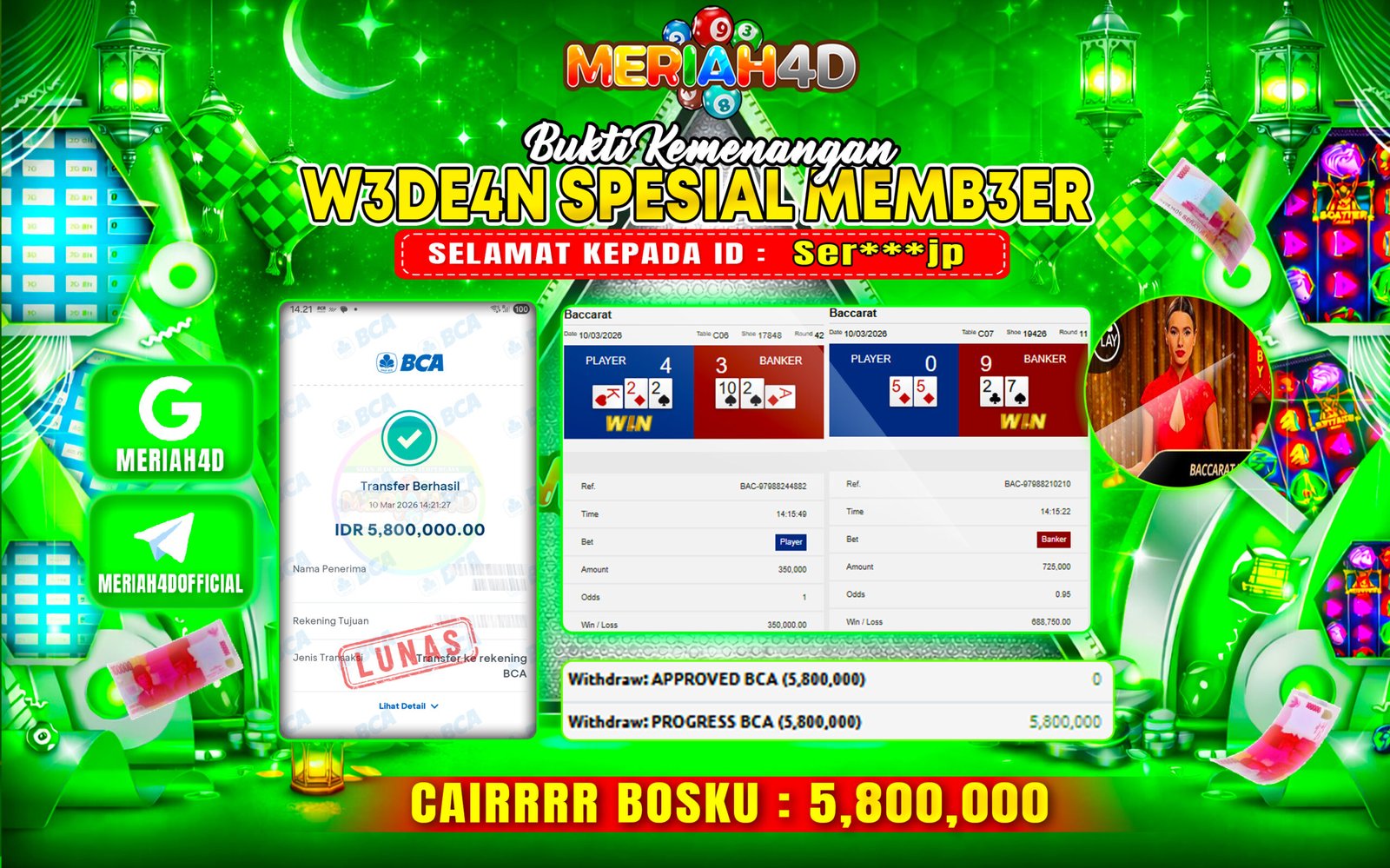 Selamat Kepada ID : SER***JP Atas Withdraw Rp. 5.800.000 Juta Hari ini. Ditunggu Withdraw Selanjutnya dan ajak juga teman temannya bergabung di Meriah4d