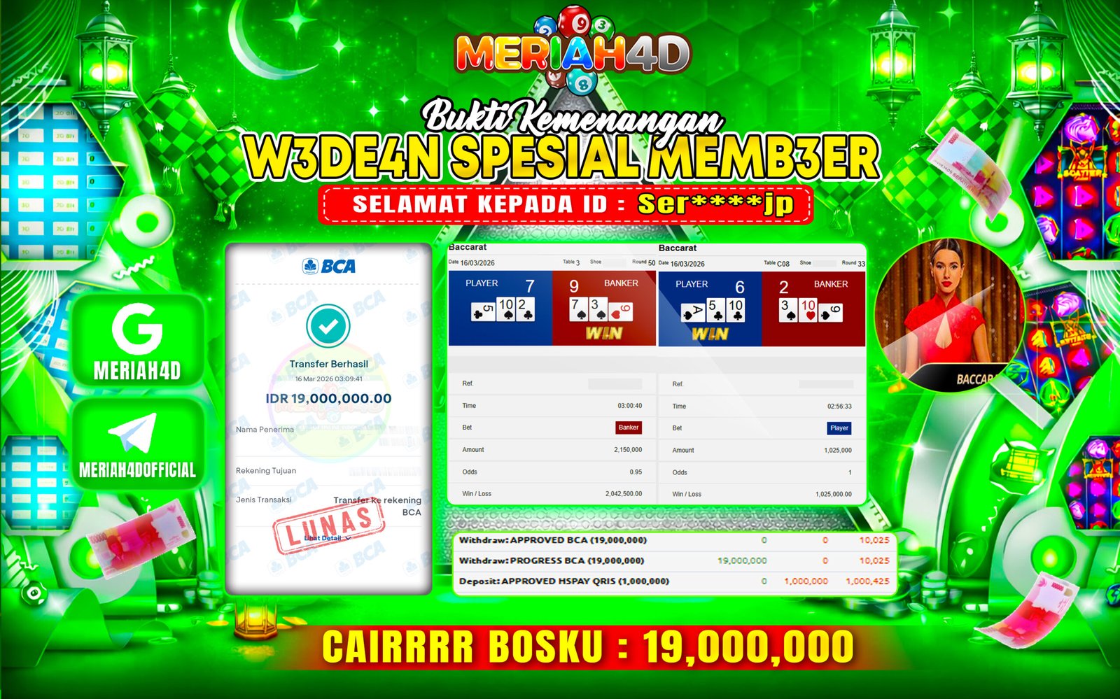 Selamat Kepada ID : Ser****gjp Atas Withdraw Rp. 19.000.000 Juta Hari ini. Ditunggu Withdraw Selanjutnya dan ajak juga teman temannya bergabung di Meriah4d