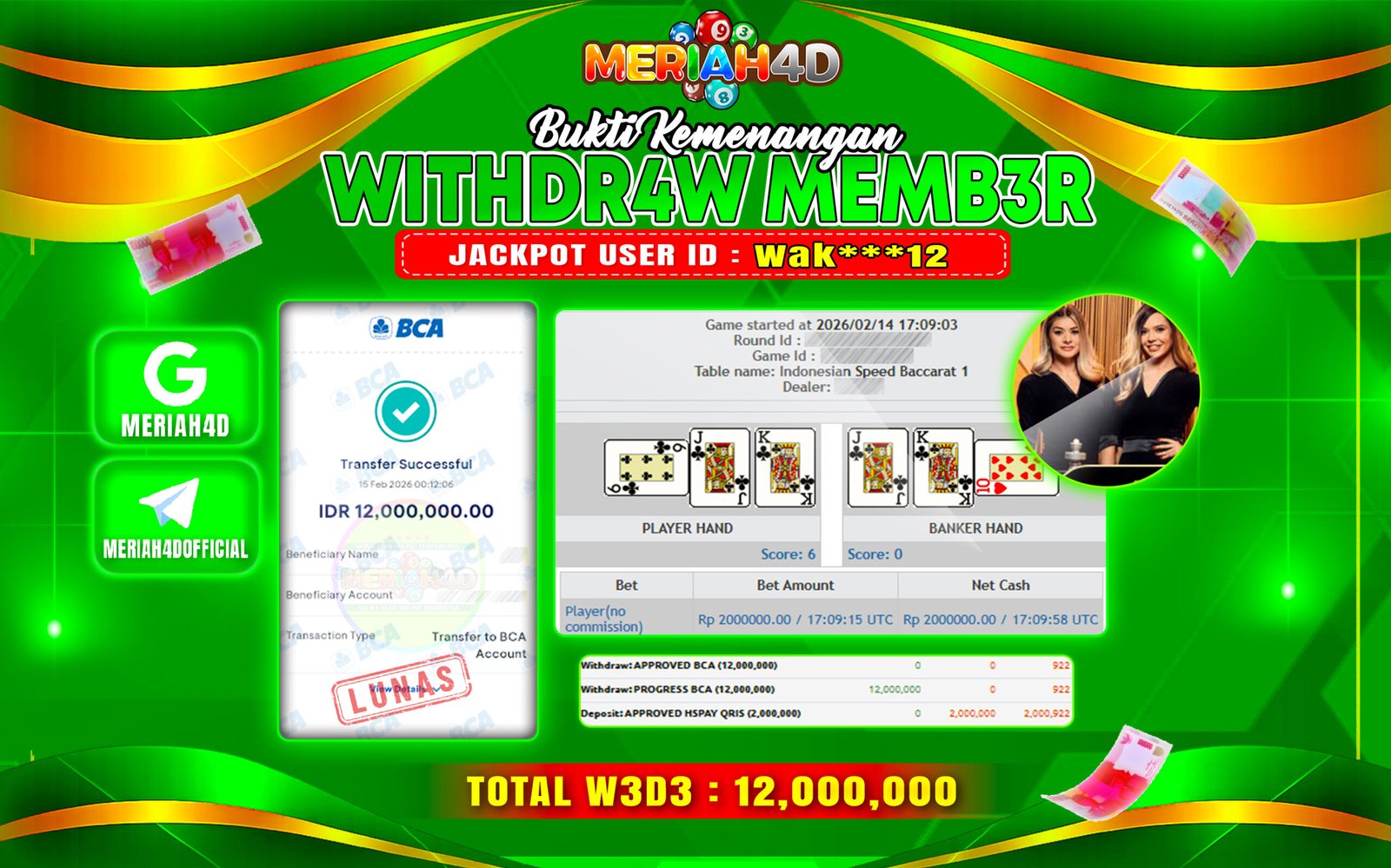 Selamat Kepada ID : WAK**12 Atas Withdraw Rp. 12.000.000 Juta Hari ini. Ditunggu Withdraw Selanjutnya dan ajak juga teman temannya bergabung di Meriah4d