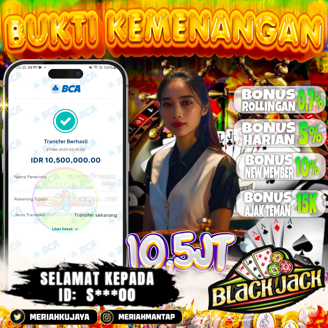 Selamat Kepada ID : S*****00 Atas Withdraw Rp. 10,500,000 Juta Hari ini. Ditunggu Withdraw Selanjutnya dan ajak juga teman temannya bergabung di Meriah4d