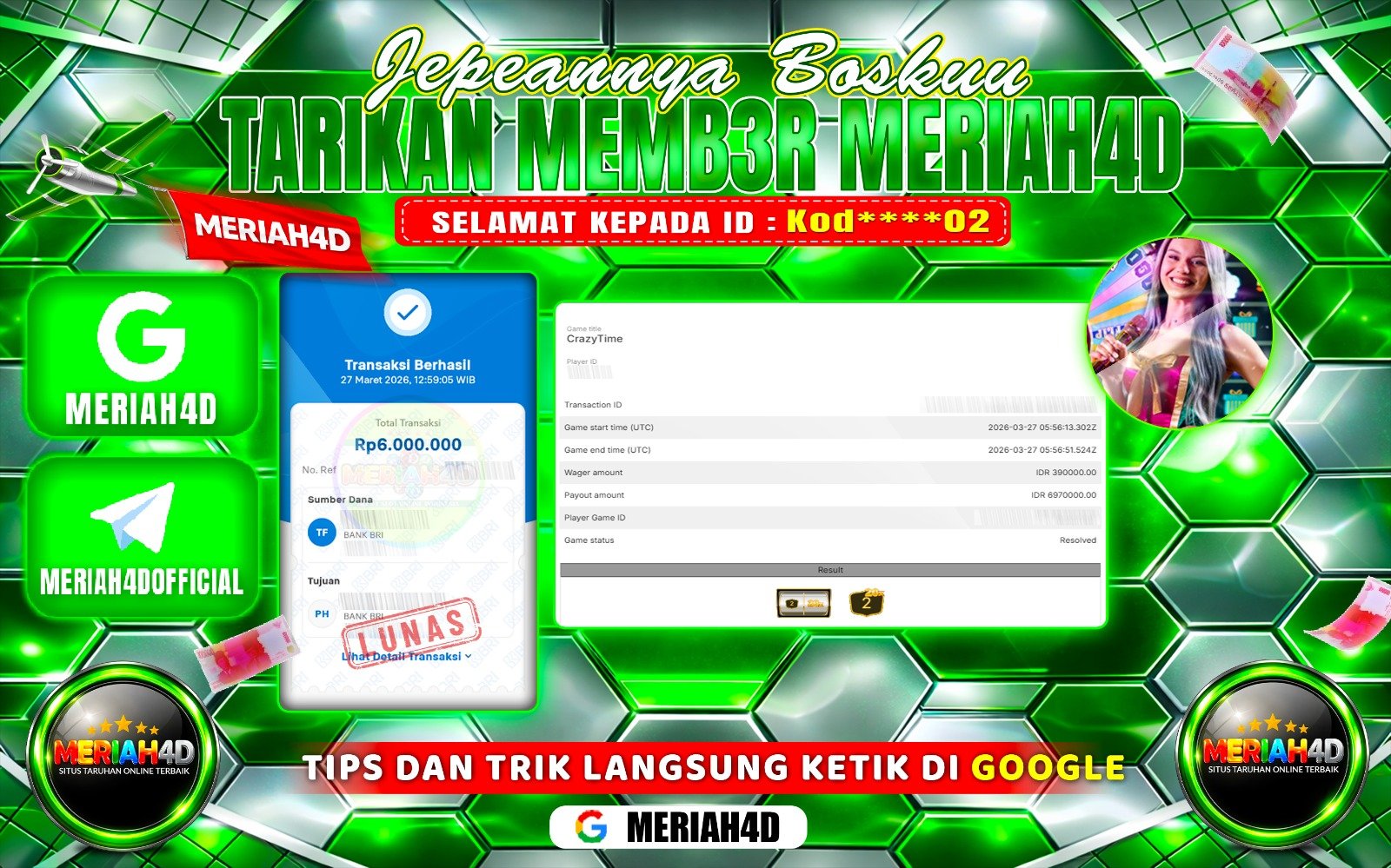 Selamat Kepada ID : Kod****02 Atas Withdraw Rp. 6.000.000 Juta Hari ini. Ditunggu Withdraw Selanjutnya dan ajak juga teman temannya bergabung di Meriah4d
