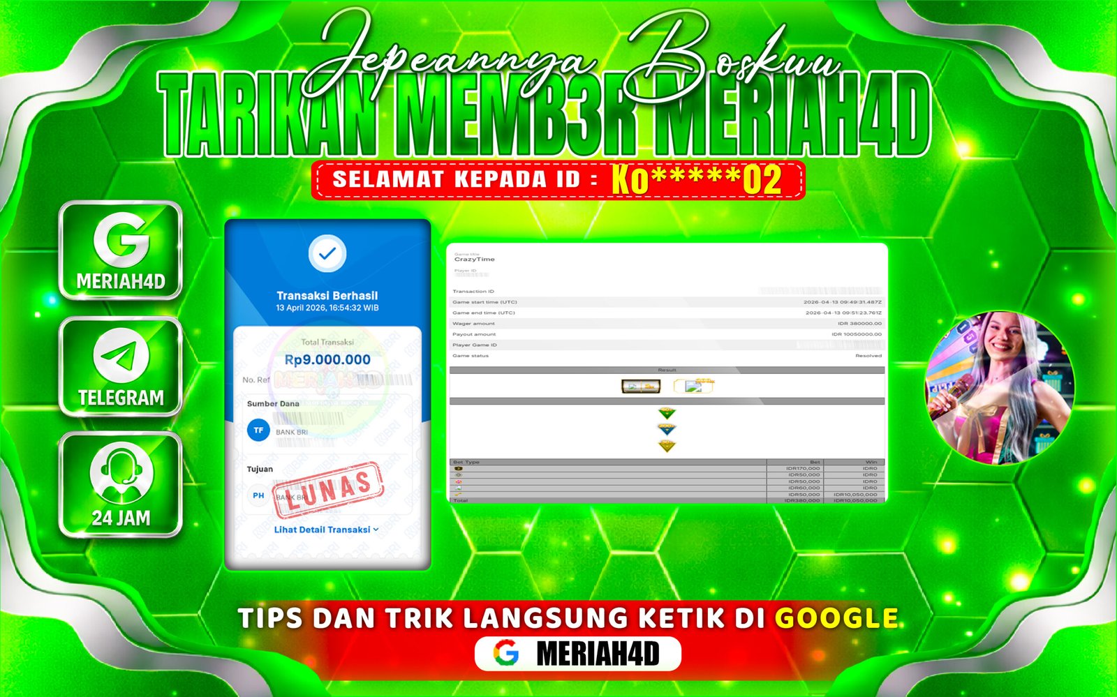 Selamat Kepada ID : Ko*****02 Atas Withdraw Rp. 9.000.000 Juta Hari ini. Ditunggu Withdraw Selanjutnya dan ajak juga teman temannya bergabung di Meriah4d