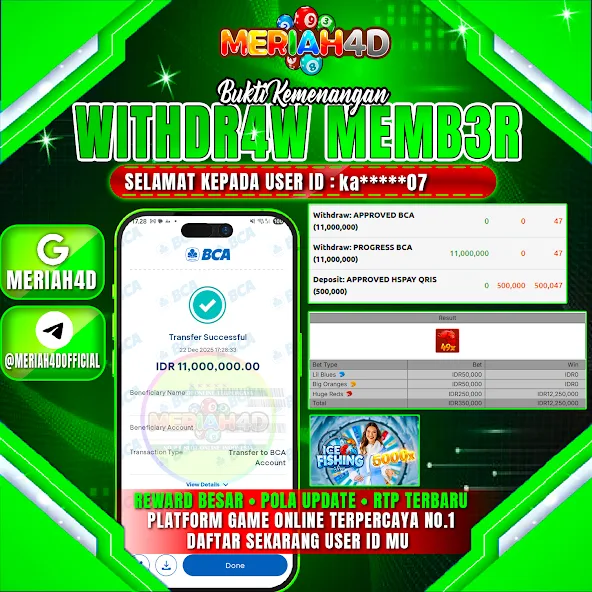 Selamat Kepada ID : KA******07 Atas Withdraw Rp. 11.000.000 Juta Hari ini. Ditunggu Withdraw Selanjutnya dan ajak juga teman temannya bergabung di Meriah4d