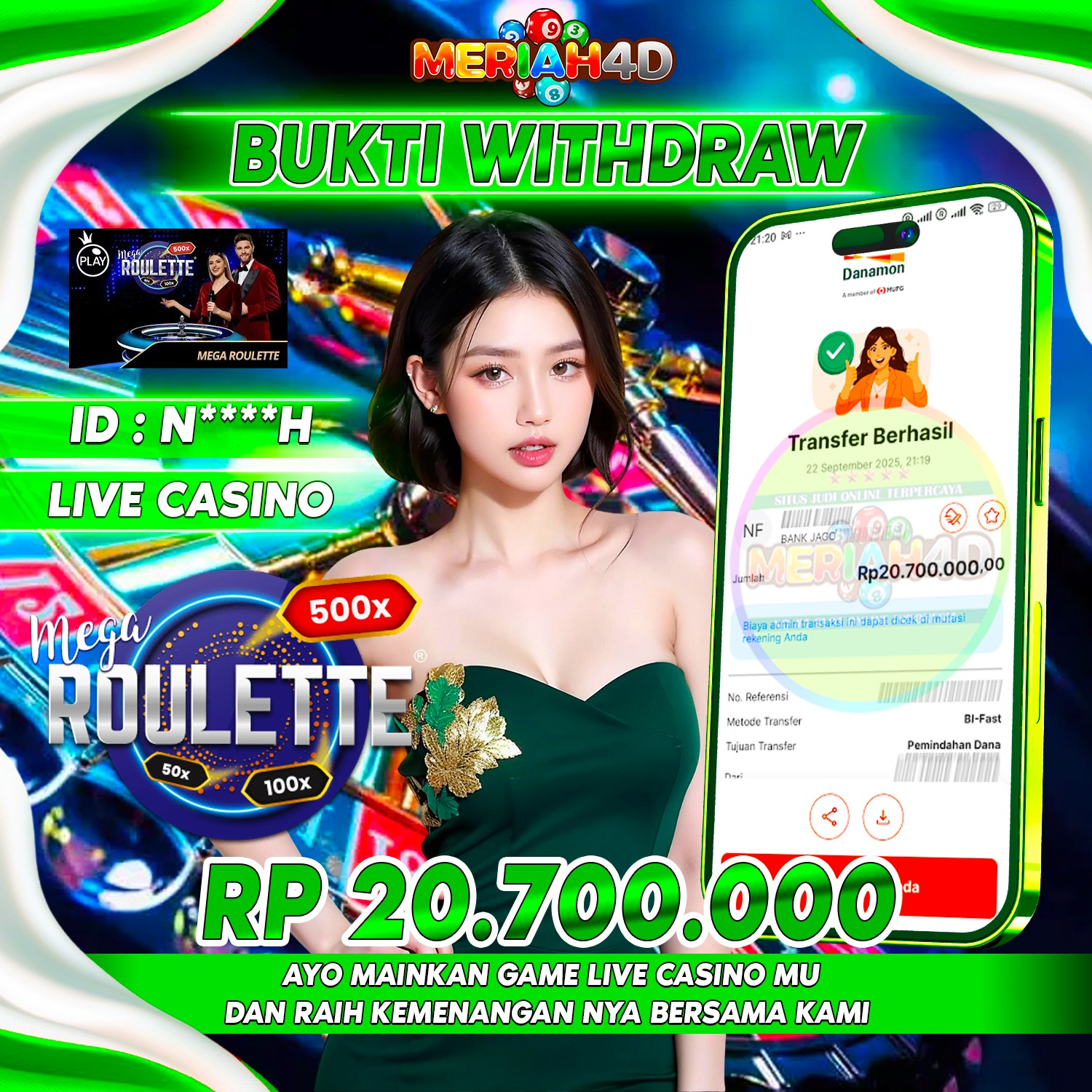 Selamat Kepada ID : N****H Atas Withdraw Rp. 20.700.000 Juta Hari ini. Ditunggu Withdraw Selanjutnya dan ajak juga teman temannya bergabung di Meriah4d