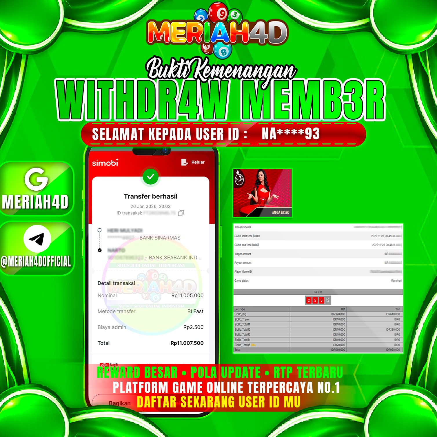 Selamat Kepada ID : NA******93 Atas Withdraw Rp. 11.005.000 Juta Hari ini. Ditunggu Withdraw Selanjutnya dan ajak juga teman temannya bergabung di Meriah4d