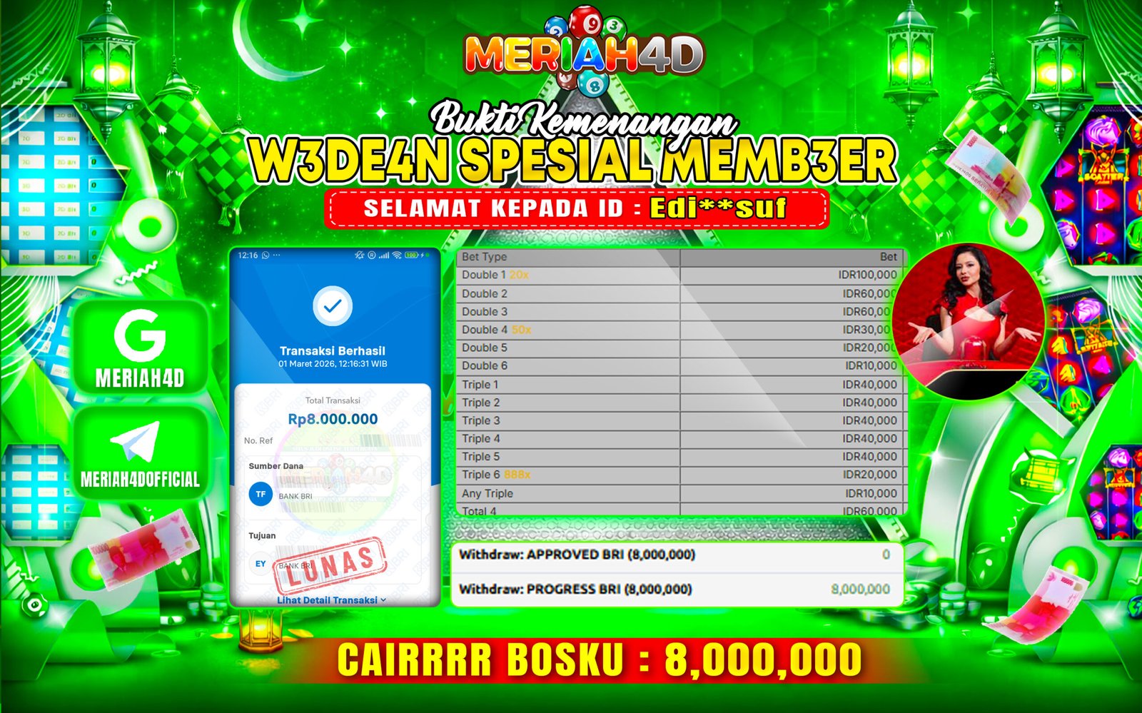 Selamat Kepada ID : EDI**SUF Atas Withdraw Rp. 8.000.000 Juta Hari ini. Ditunggu Withdraw Selanjutnya dan ajak juga teman temannya bergabung di Meriah4d