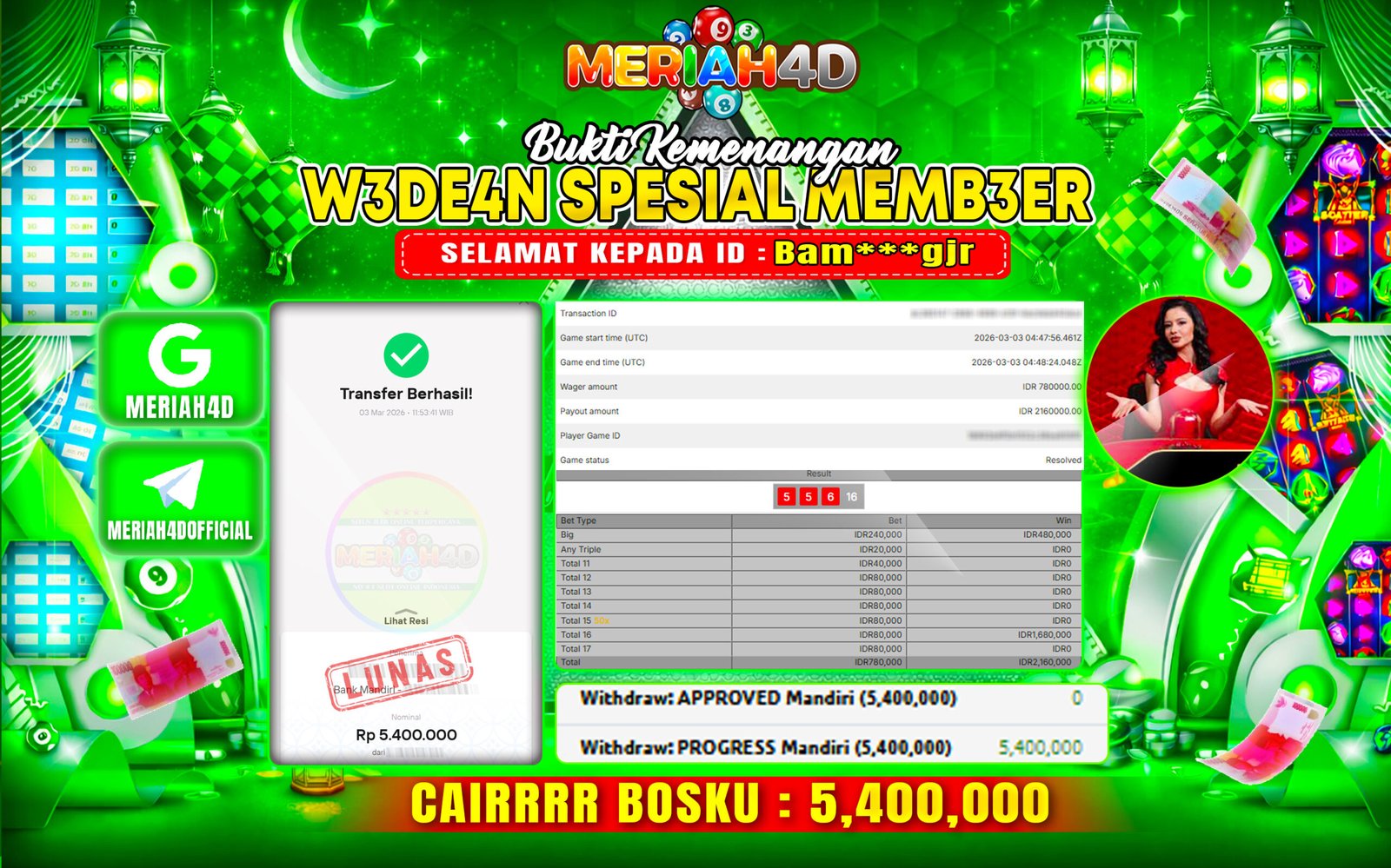Selamat Kepada ID : BAM***GJR Atas Withdraw Rp. 5.400.000 Juta Hari ini. Ditunggu Withdraw Selanjutnya dan ajak juga teman temannya bergabung di Meriah4d