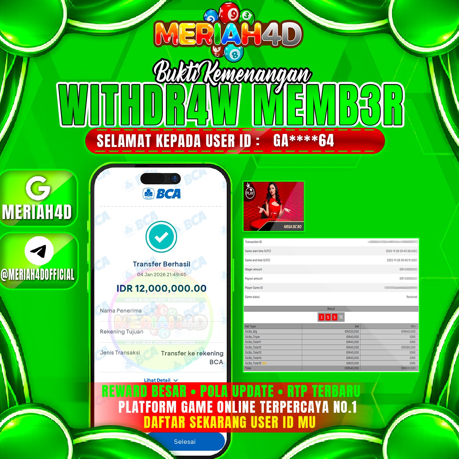 Selamat Kepada ID : GA******64 Atas Withdraw Rp. 12.000.000 Juta Hari ini. Ditunggu Withdraw Selanjutnya dan ajak juga teman temannya bergabung di Meriah4d
