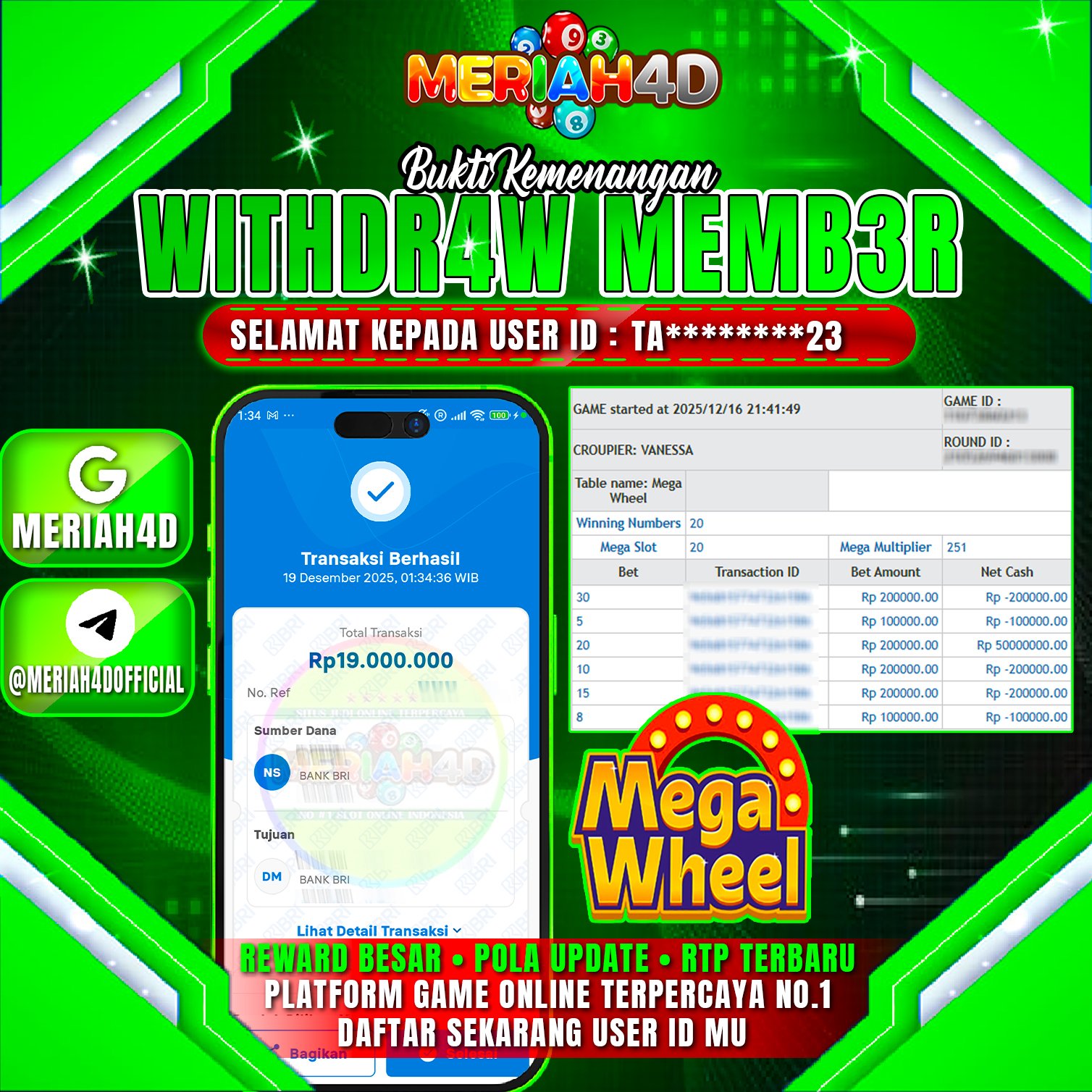 Selamat Kepada ID : TA******23 Atas Withdraw Rp.19.000.000 Juta Hari ini. Ditunggu Withdraw Selanjutnya dan ajak juga teman temannya bergabung di Meriah4d