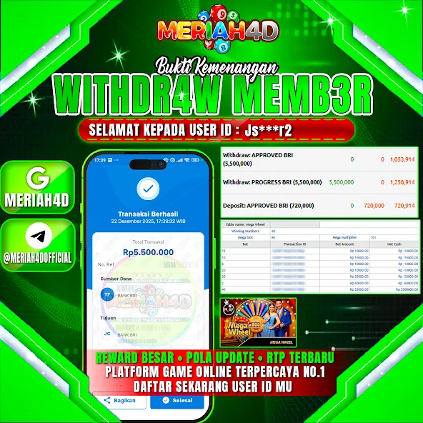 Selamat Kepada ID : JS******R2 Atas Withdraw Rp. 5.500.000 Juta Hari ini. Ditunggu Withdraw Selanjutnya dan ajak juga teman temannya bergabung di Meriah4d