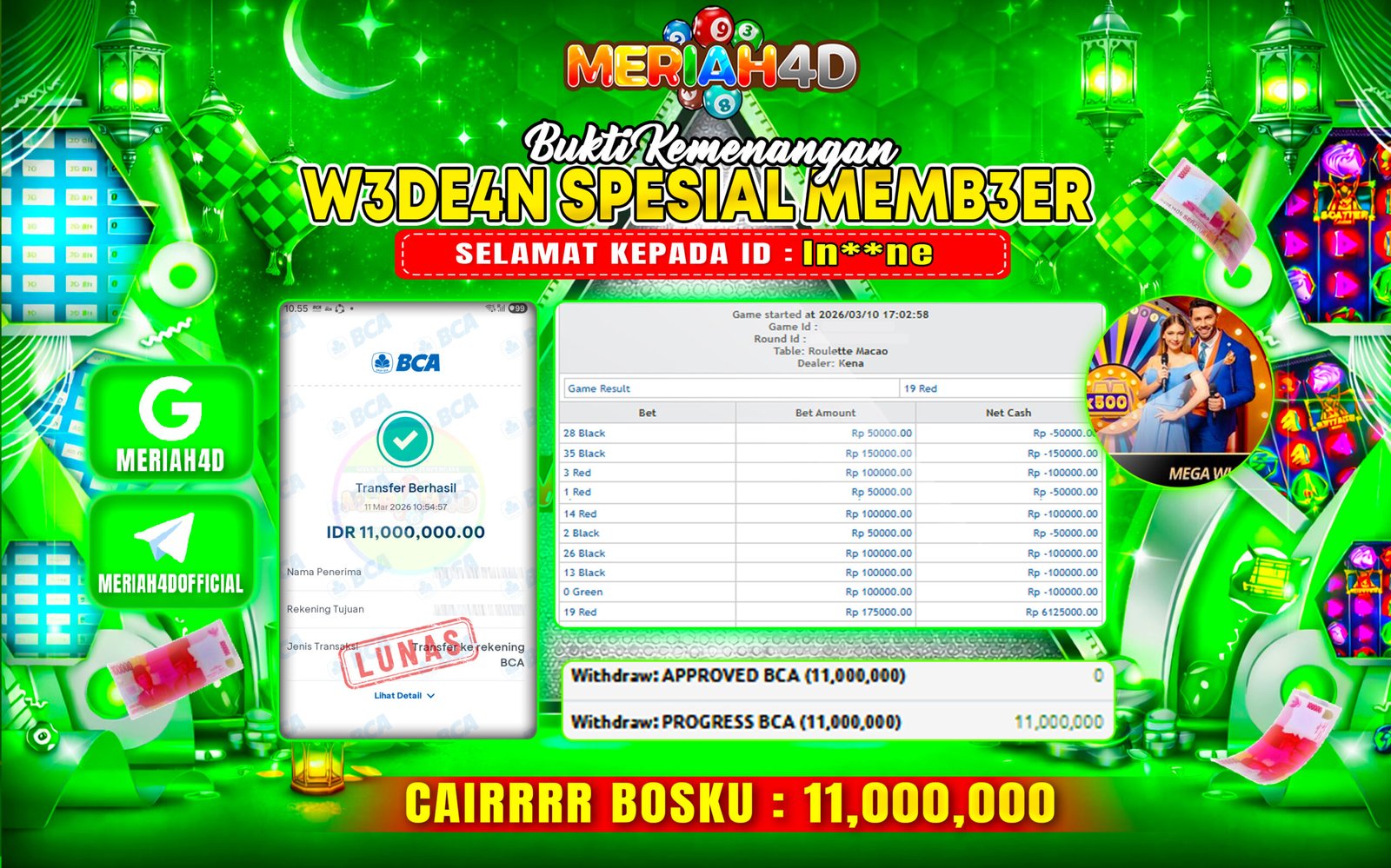 Selamat Kepada Id : In**ne Atas Withdraw Rp. 11.000.000 Juta Hari ini. Ditunggu Withdraw Selanjutnya dan ajak juga teman temannya bergabung di Meriah4d