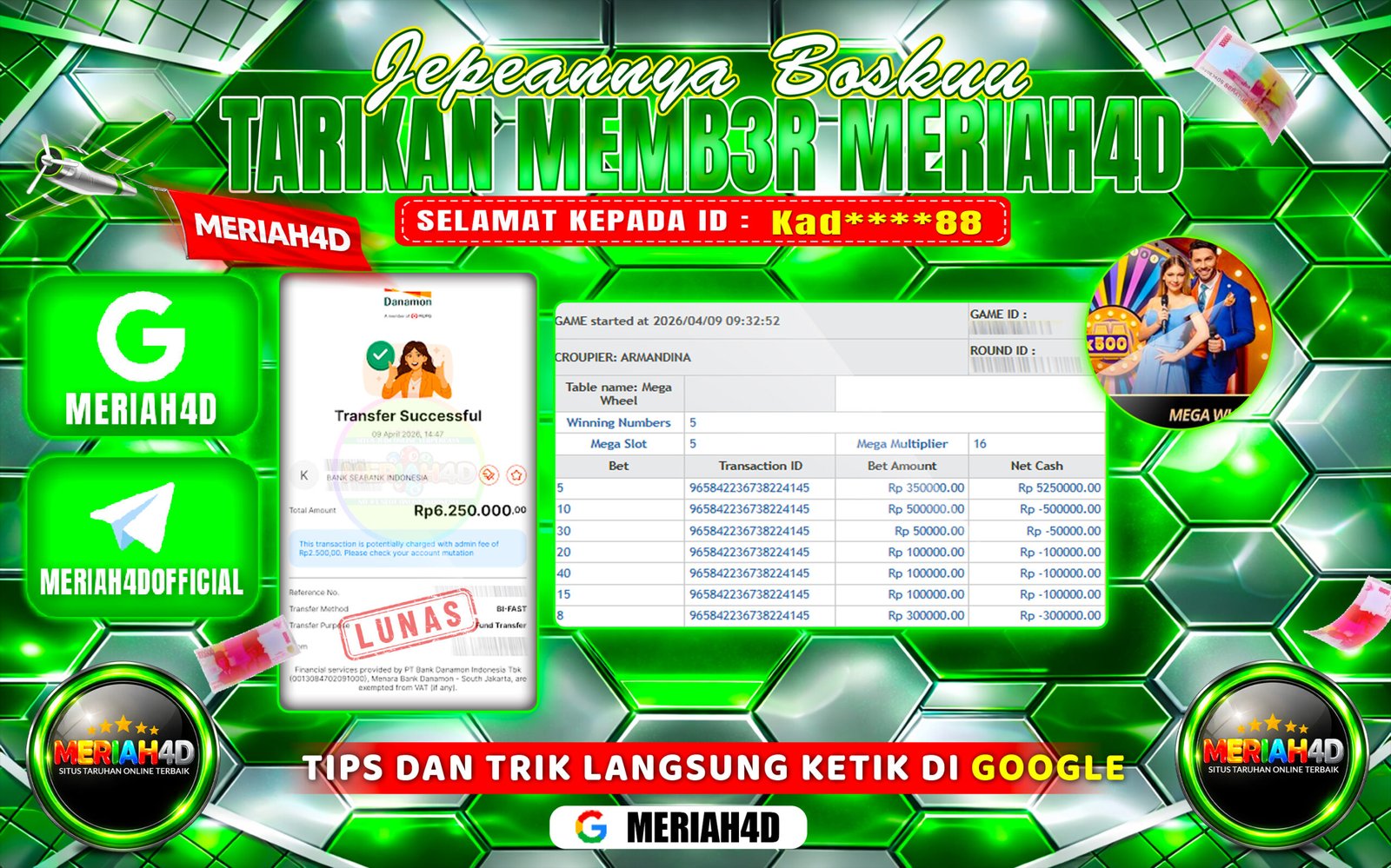Selamat Kepada ID : Kad****88 Atas Withdraw Rp. 6.250.000 Juta Hari ini. Ditunggu Withdraw Selanjutnya dan ajak juga teman temannya bergabung di Meriah4d