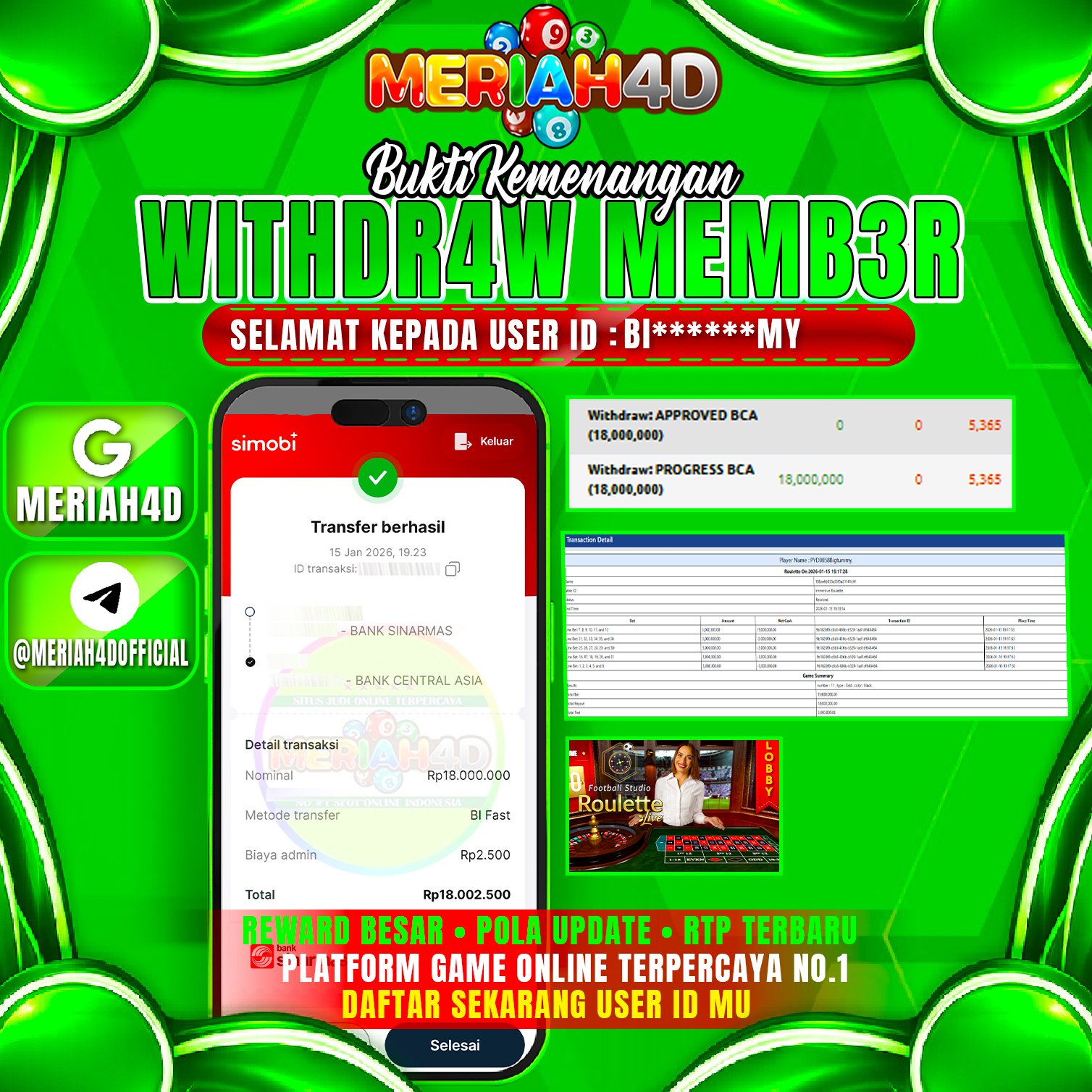 Selamat Kepada ID : BI*******MY Atas Withdraw Rp. 18.000.000 Juta Hari ini. Ditunggu Withdraw Selanjutnya dan ajak juga teman temannya bergabung di Meriah4d