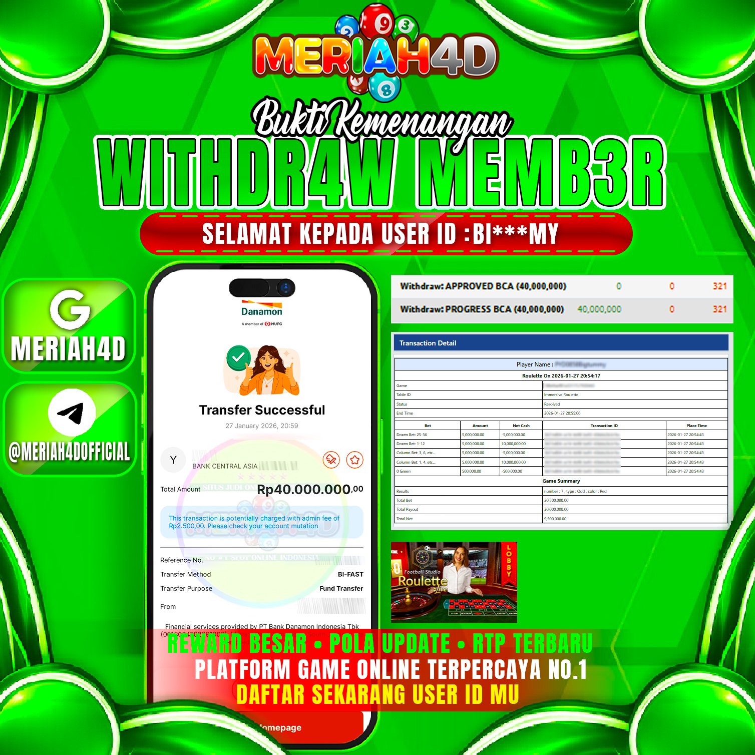 Selamat Kepada ID : BY******MY Atas Withdraw Rp. 40.000.000 Juta Hari ini. Ditunggu Withdraw Selanjutnya dan ajak juga teman temannya bergabung di Meriah4d