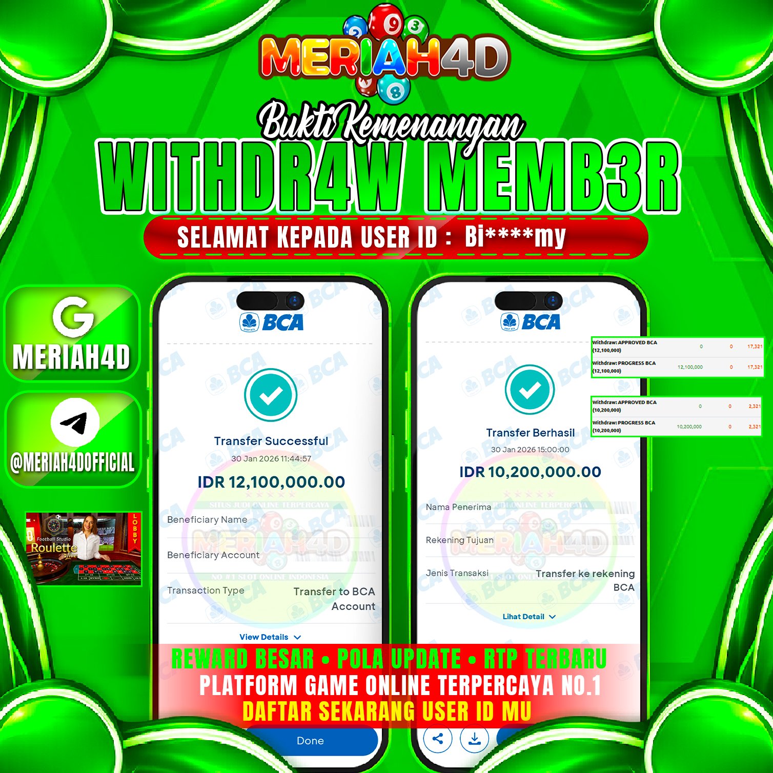 Selamat Kepada ID : BI******MY Atas Withdraw Rp. 22.300.000 Juta Hari ini. Ditunggu Withdraw Selanjutnya dan ajak juga teman temannya bergabung di Meriah4d