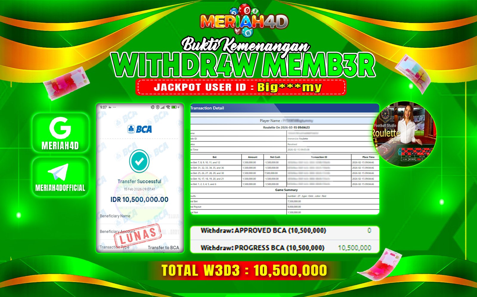 Selamat Kepada ID : BIG***MY Atas Withdraw Rp. 10.500.000 Juta Hari ini. Ditunggu Withdraw Selanjutnya dan ajak juga teman temannya bergabung di Meriah4d