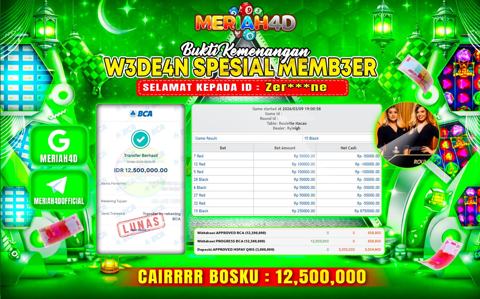 Selamat Kepada ID : ZER***NE Atas Withdraw Rp. 12.500.000 Juta Hari ini. Ditunggu Withdraw Selanjutnya dan ajak juga teman temannya bergabung di Meriah4d