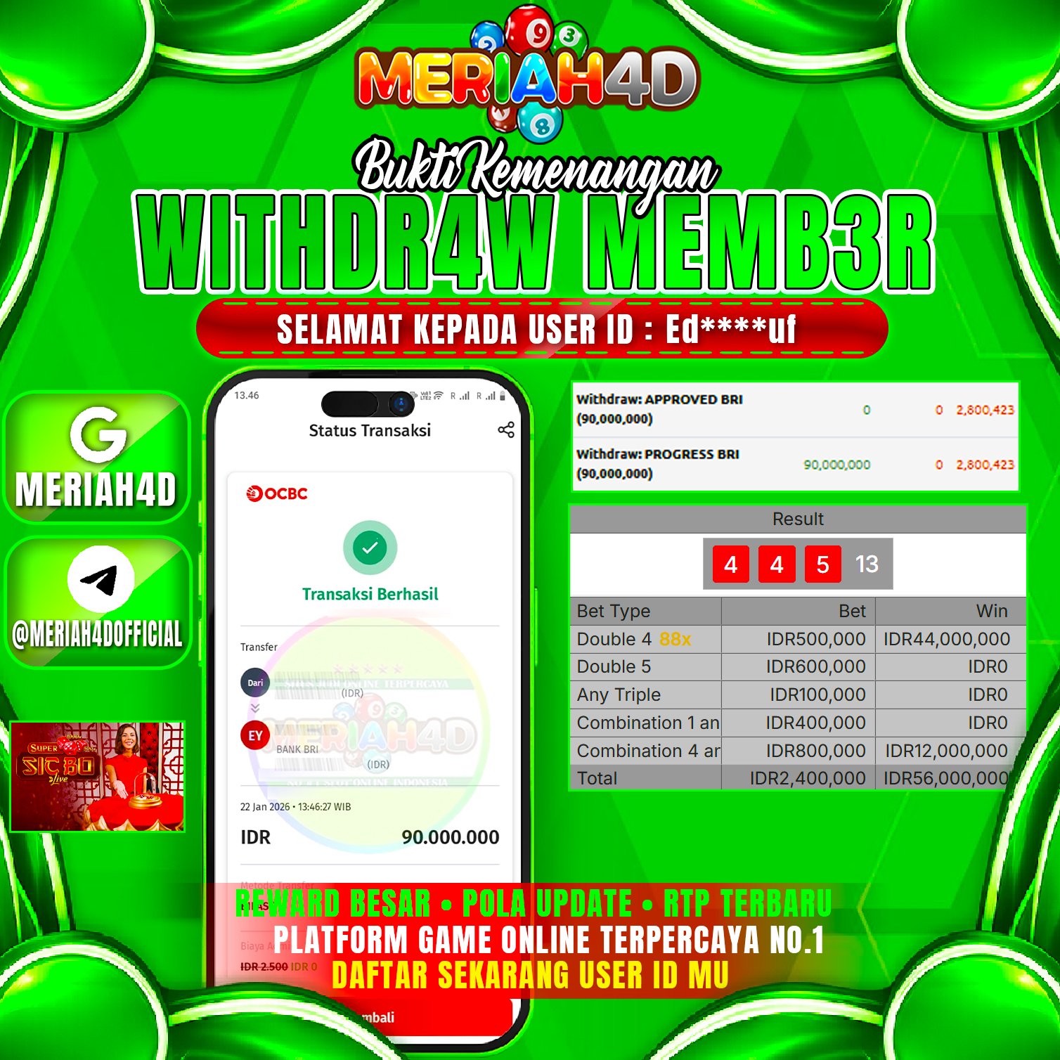 Selamat Kepada ID : ED******UF Atas Withdraw Rp. 90.000.000 Juta Hari ini. Ditunggu Withdraw Selanjutnya dan ajak juga teman temannya bergabung di Meriah4d