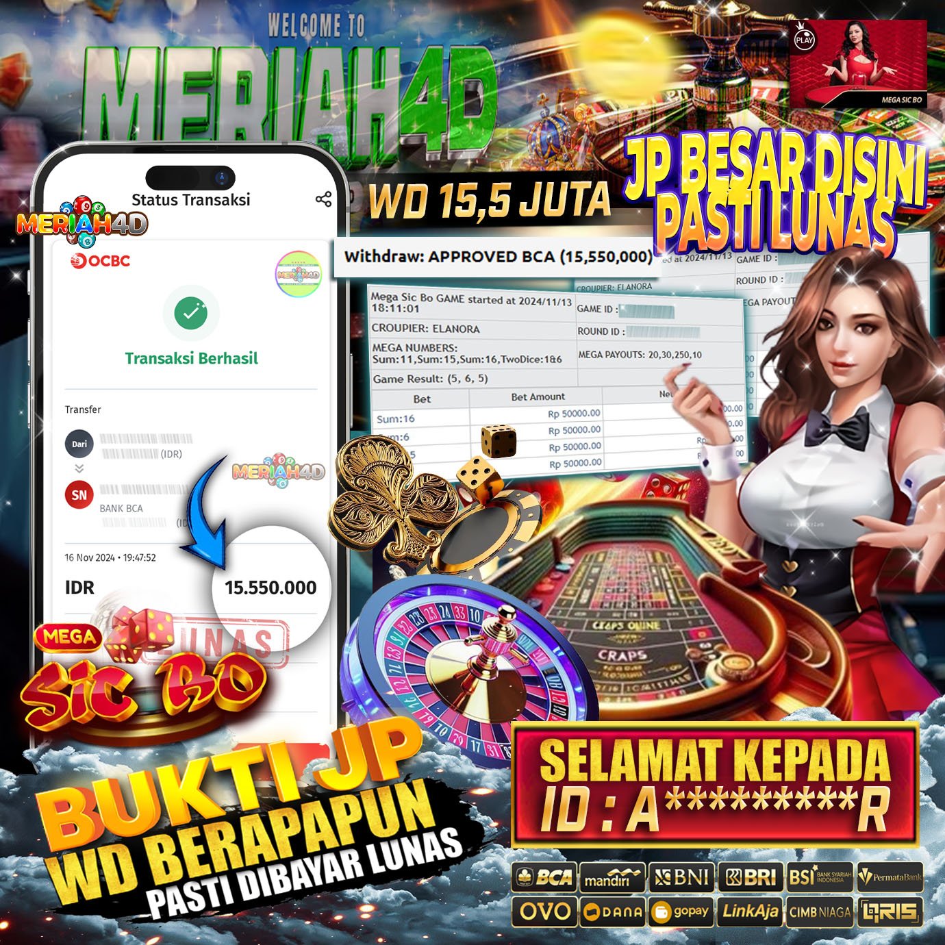 Selamat Kepada Id : A********R Atas Withdraw Rp. 15.500.000 Juta Hari ini. Ditunggu Withdraw Selanjutnya dan ajak juga teman temannya bergabung di Meriah4d