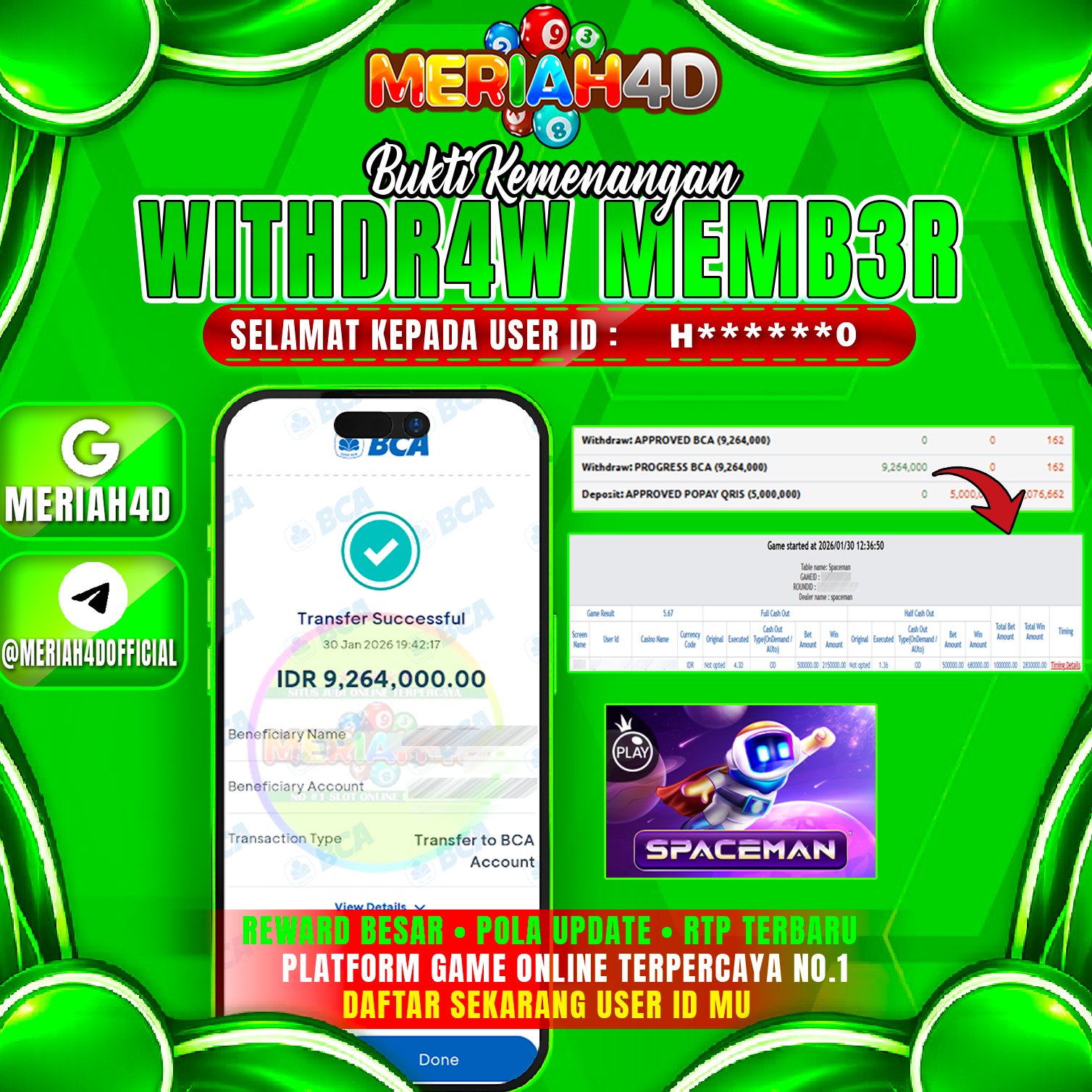 Selamat Kepada ID : H*****O Atas Withdraw Rp. 9.264.000 Juta Hari ini. Ditunggu Withdraw Selanjutnya dan ajak juga teman temannya bergabung di Meriah4d