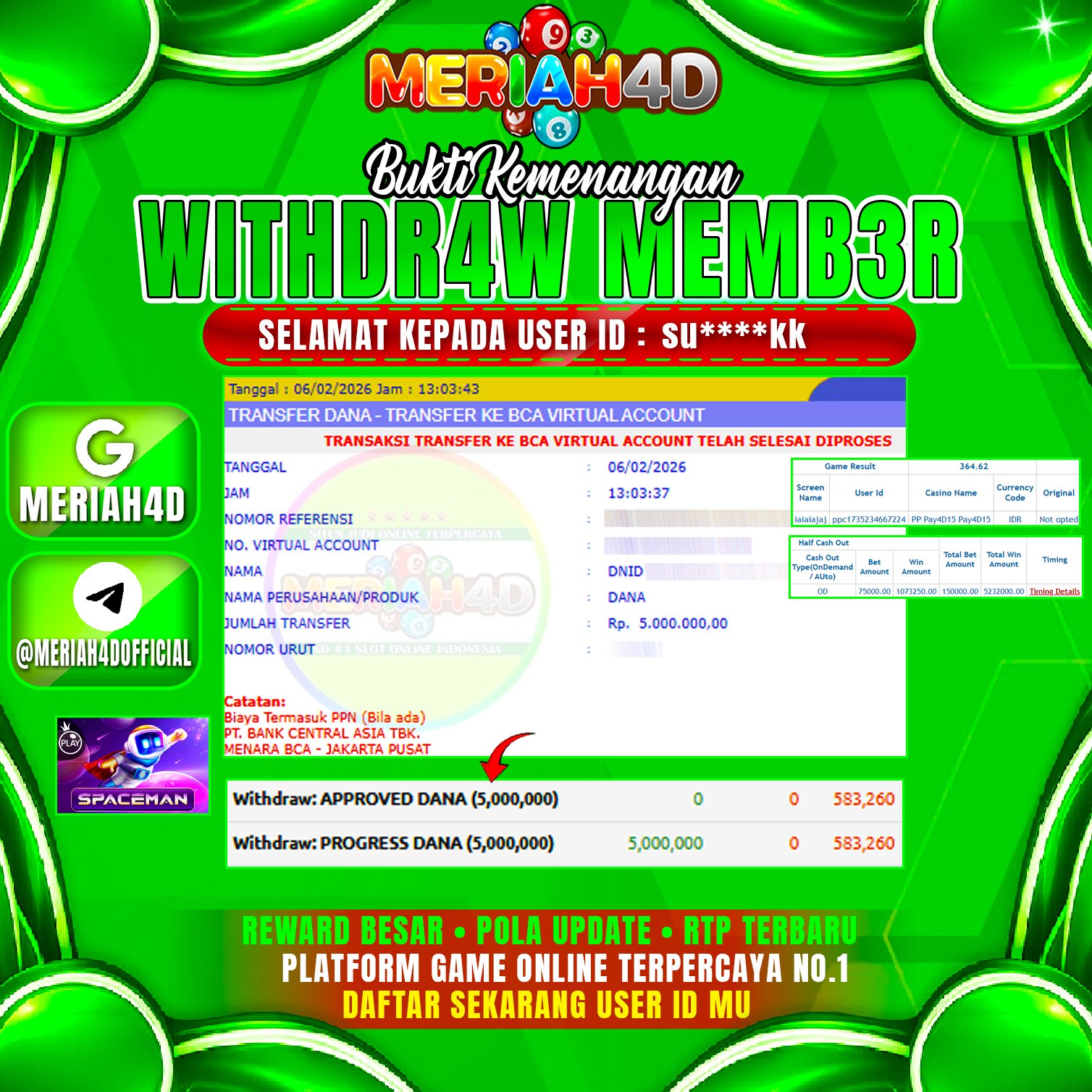 Selamat Kepada ID : SU****KK Atas Withdraw Rp. 5.000.000 Juta Hari ini. Ditunggu Withdraw Selanjutnya dan ajak juga teman temannya bergabung di Meriah4d