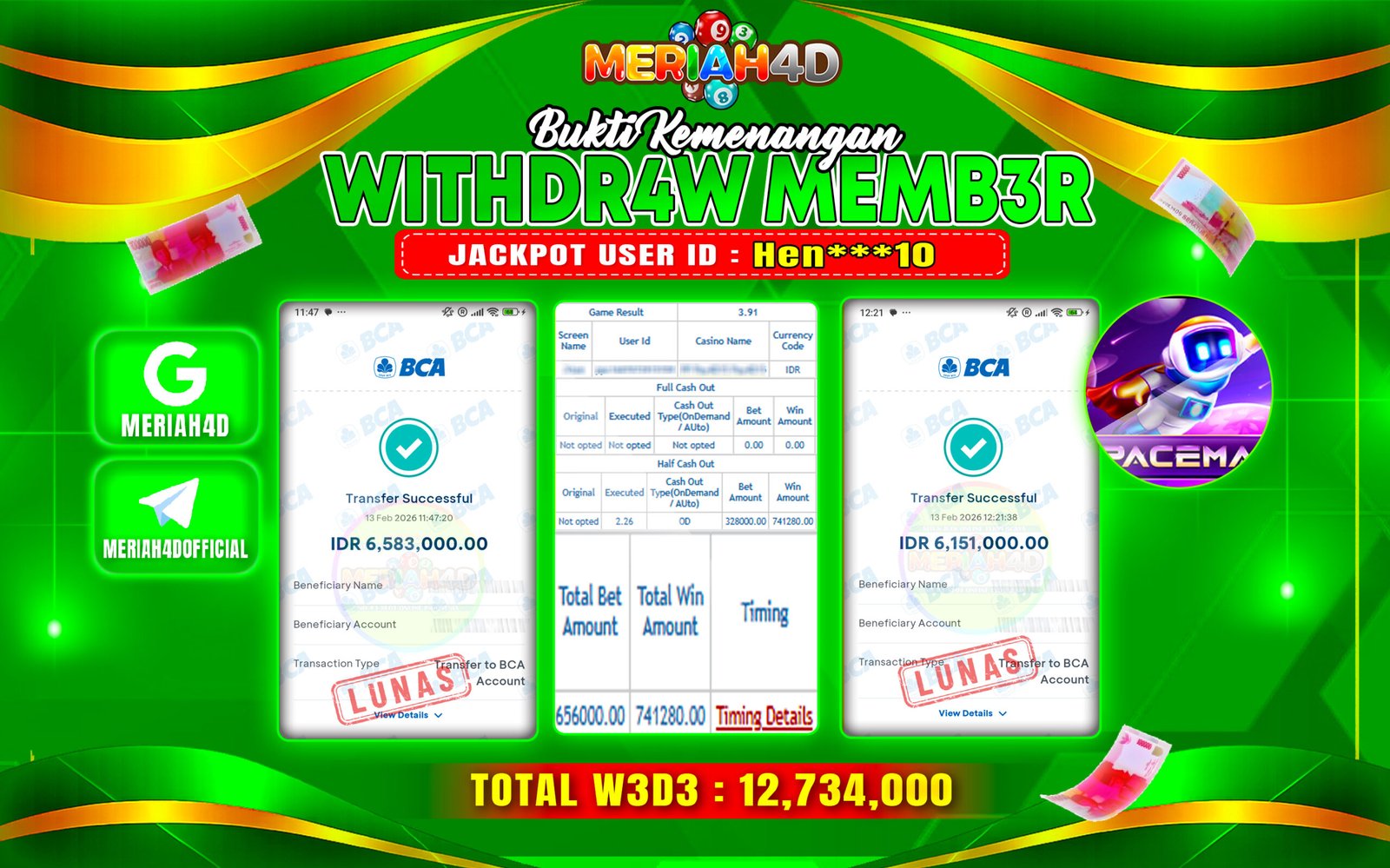 Selamat Kepada ID : HEN***10 Atas Withdraw Rp. 12.734.000 Juta Hari ini. Ditunggu Withdraw Selanjutnya dan ajak juga teman temannya bergabung di Meriah4d