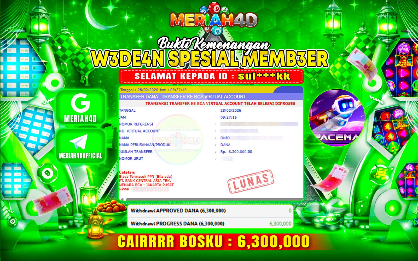 Selamat Kepada ID : SUL***KK Atas Withdraw Rp. 6.300.000 Juta Hari ini. Ditunggu Withdraw Selanjutnya dan ajak juga teman temannya bergabung di Meriah4d