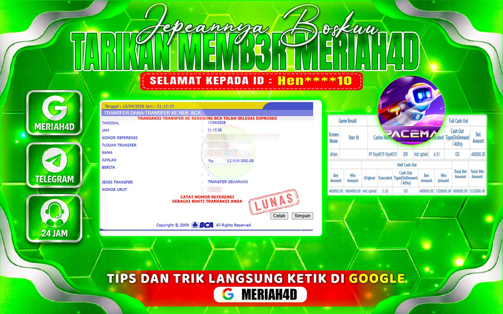 Selamat Kepada ID : Hen****10 Atas Withdraw Rp. 12.939.000 Juta Hari ini. Ditunggu Withdraw Selanjutnya dan ajak juga teman temannya bergabung di Meriah4d