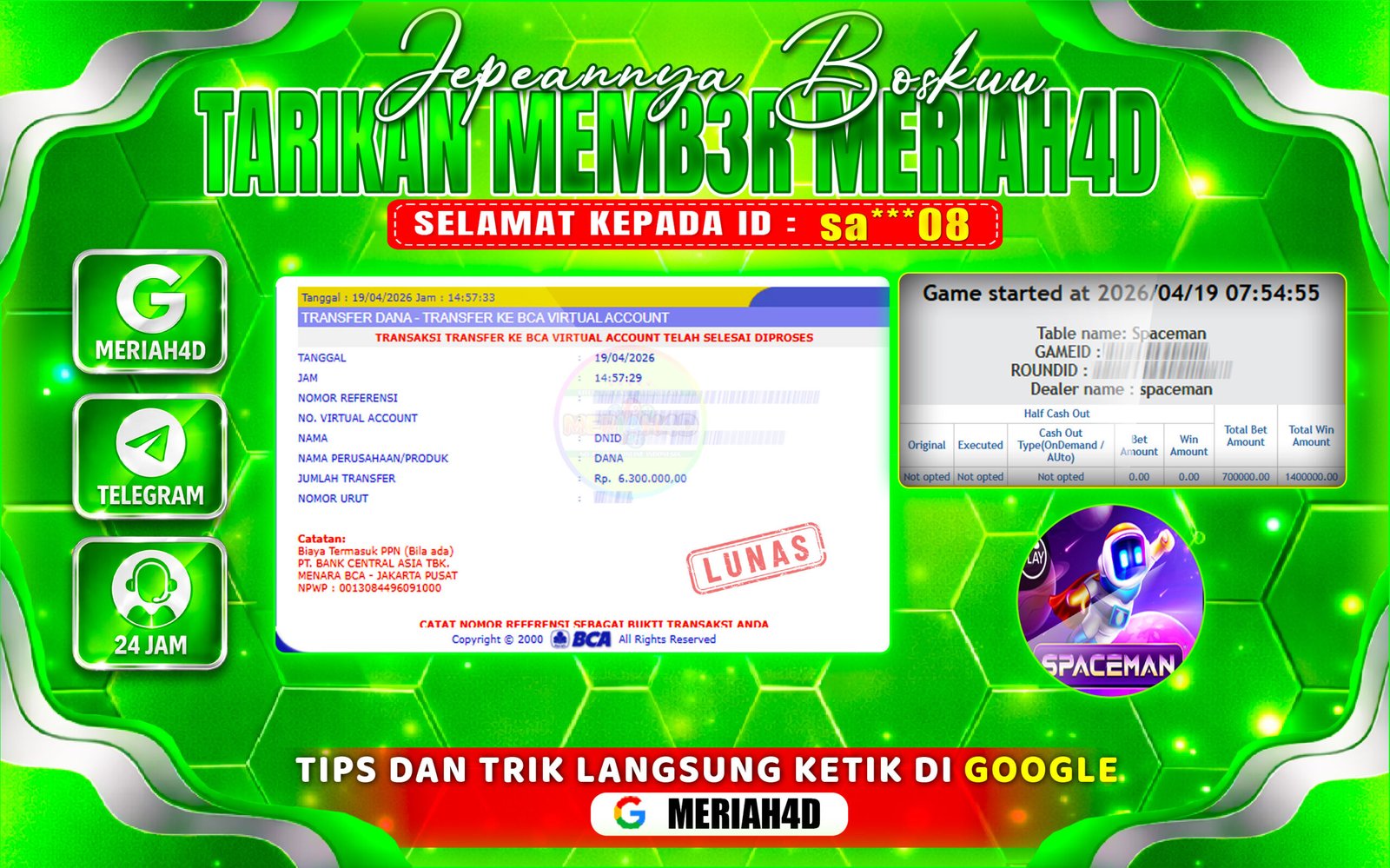 Selamat Kepada ID : sa***08 Atas Withdraw Rp. 6.300.000 Juta Hari ini. Ditunggu Withdraw Selanjutnya dan ajak juga teman temannya bergabung di Meriah4d