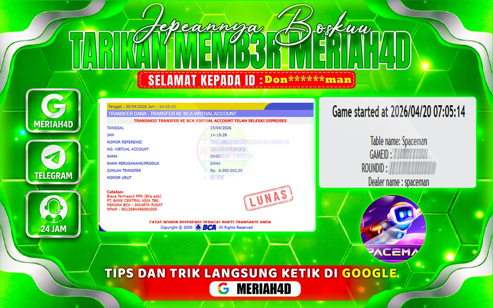 Selamat Kepada ID : Don******man Atas Withdraw Rp. 6.000.000 Juta Hari ini. Ditunggu Withdraw Selanjutnya dan ajak juga teman temannya bergabung di Meriah4d