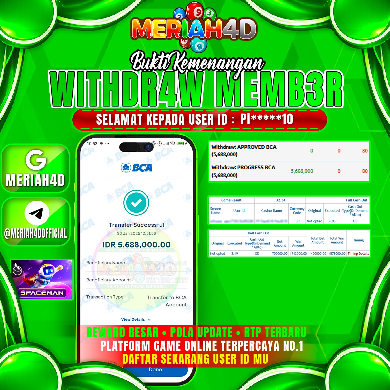 Selamat Kepada ID : PI*****10 Atas Withdraw Rp. 5.688.000 Juta Hari ini. Ditunggu Withdraw Selanjutnya dan ajak juga teman temannya bergabung di Meriah4d