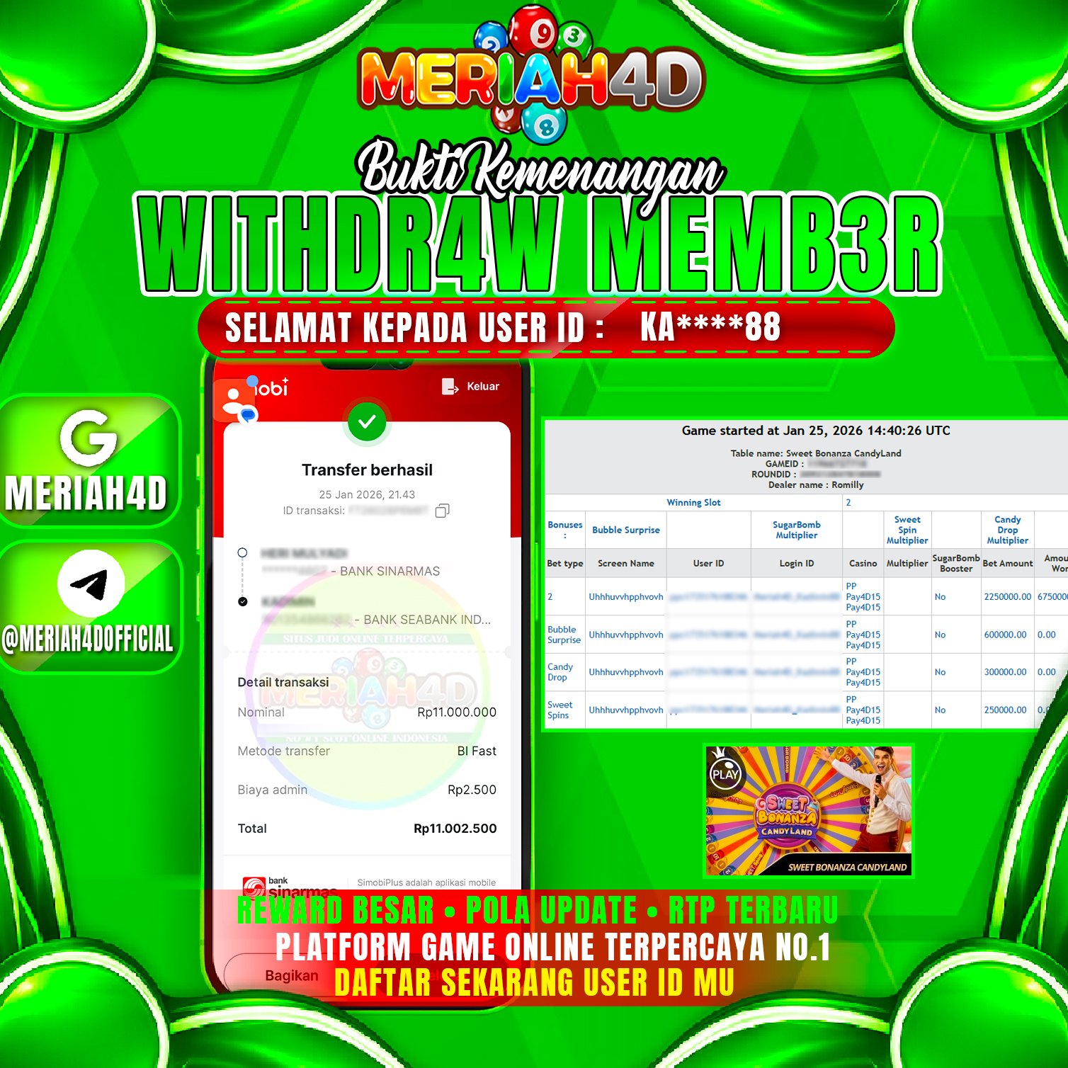 Selamat Kepada ID : KA******88 Atas Withdraw Rp. 11.000.000 Juta Hari ini. Ditunggu Withdraw Selanjutnya dan ajak juga teman temannya bergabung di Meriah4d