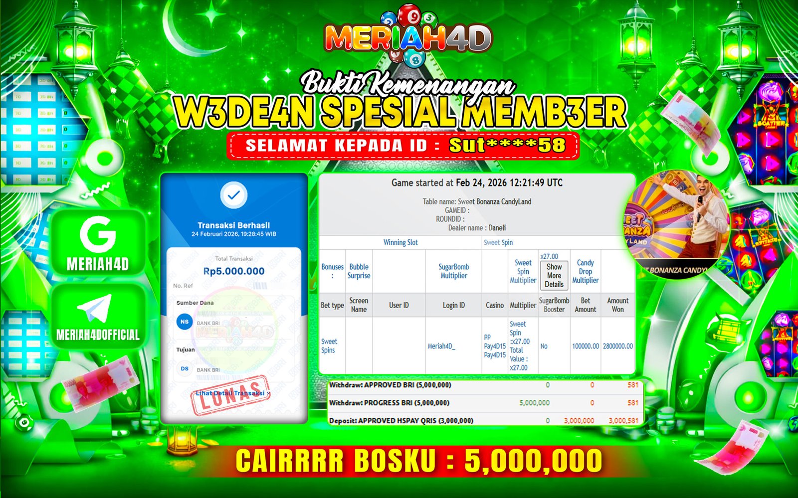 Selamat Kepada ID : SUT****58 Atas Withdraw Rp. 5.000.000 Juta Hari ini. Ditunggu Withdraw Selanjutnya dan ajak juga teman temannya bergabung di Meriah4d