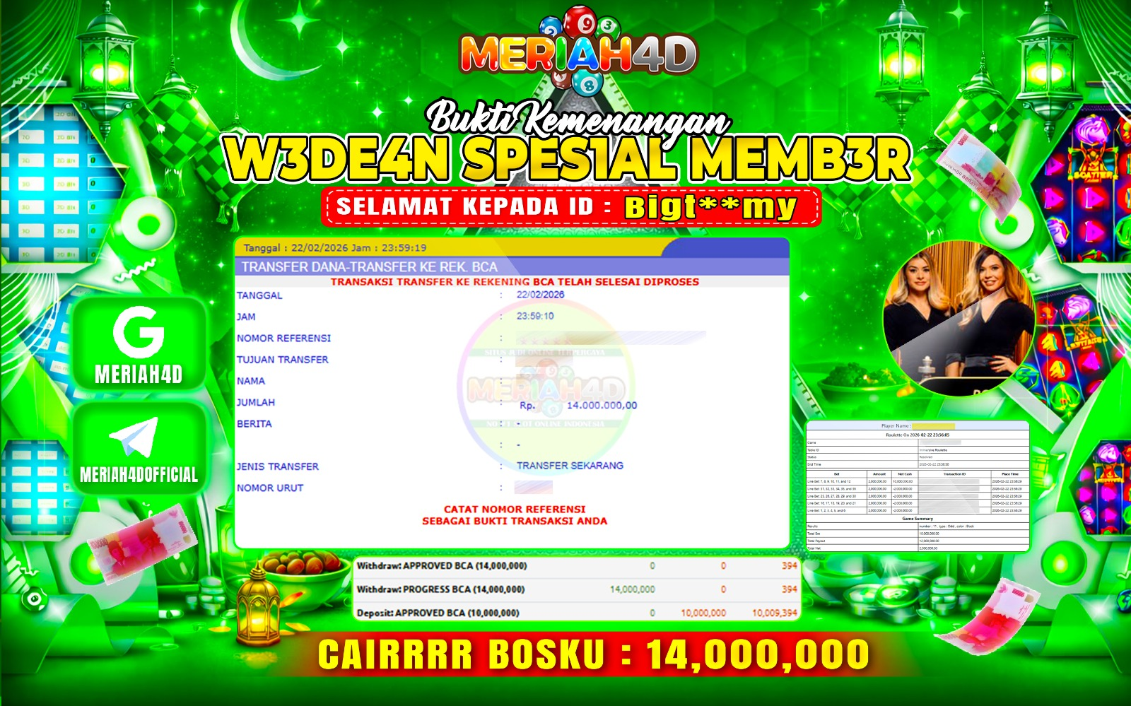 Selamat Kepada ID : BIGT**MY Atas Withdraw Rp. 26.700.000 Juta Hari ini. Ditunggu Withdraw Selanjutnya dan ajak juga teman temannya bergabung di Meriah4d