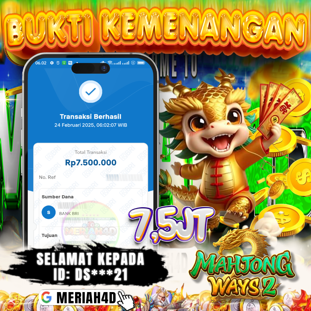 Selamat Kepada ID : DS***21 Atas Withdraw Rp. 7.500.000 Juta Hari ini. Ditunggu Withdraw Selanjutnya dan ajak juga teman temannya bergabung di Meriah4d