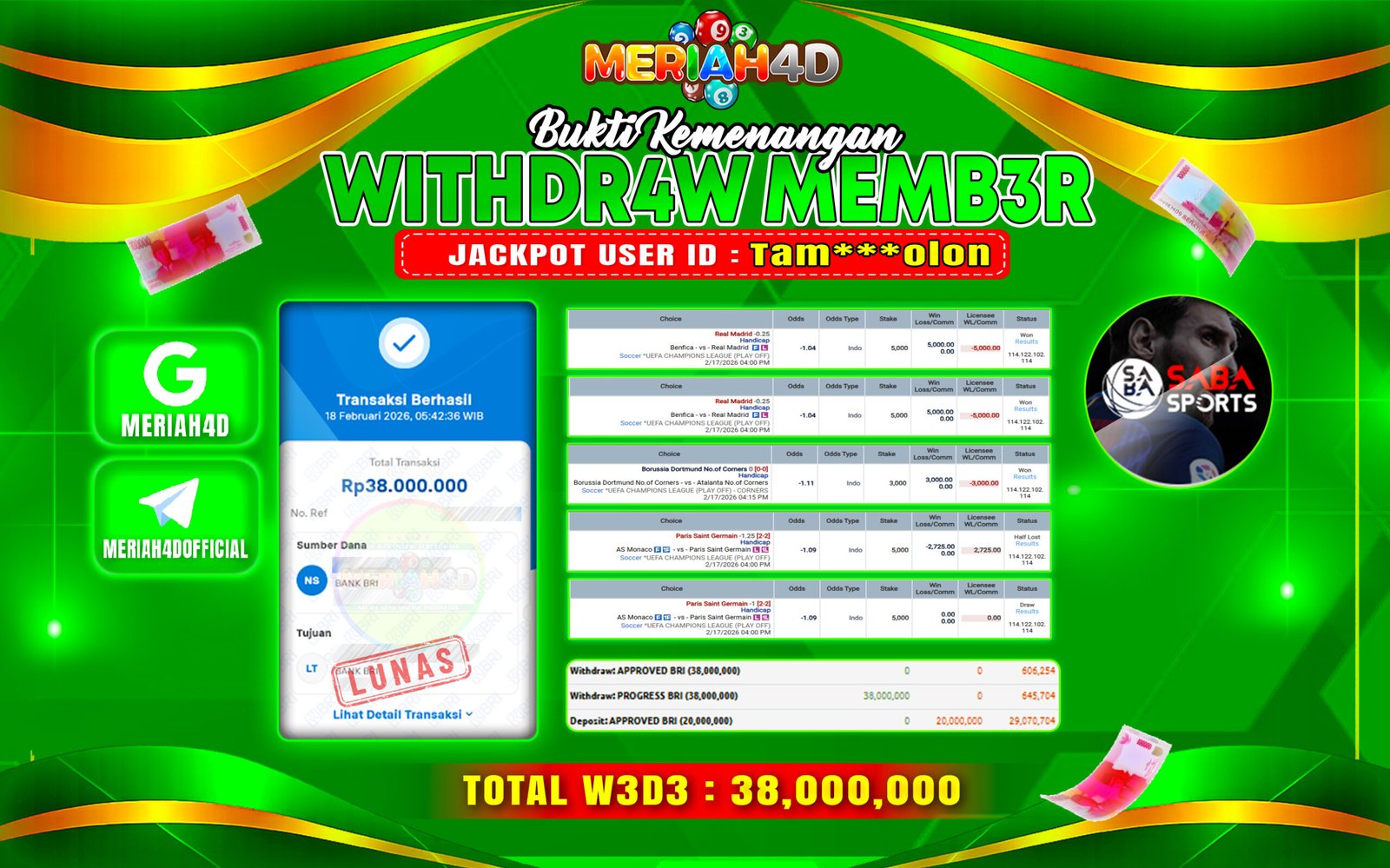 Selamat Kepada ID : TAM******OLON Atas Withdraw Rp. 38.000.000 Juta Hari ini. Ditunggu Withdraw Selanjutnya dan ajak juga teman temannya bergabung di Meriah4d