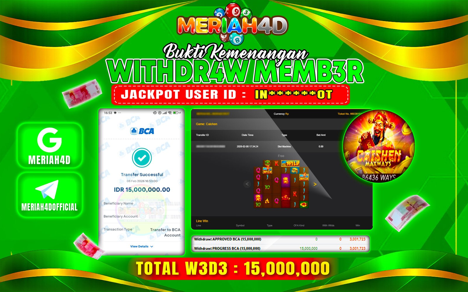 Selamat Kepada ID : IN******OT Atas Withdraw Rp. 15.000.000 Juta Hari ini. Ditunggu Withdraw Selanjutnya dan ajak juga teman temannya bergabung di Meriah4d