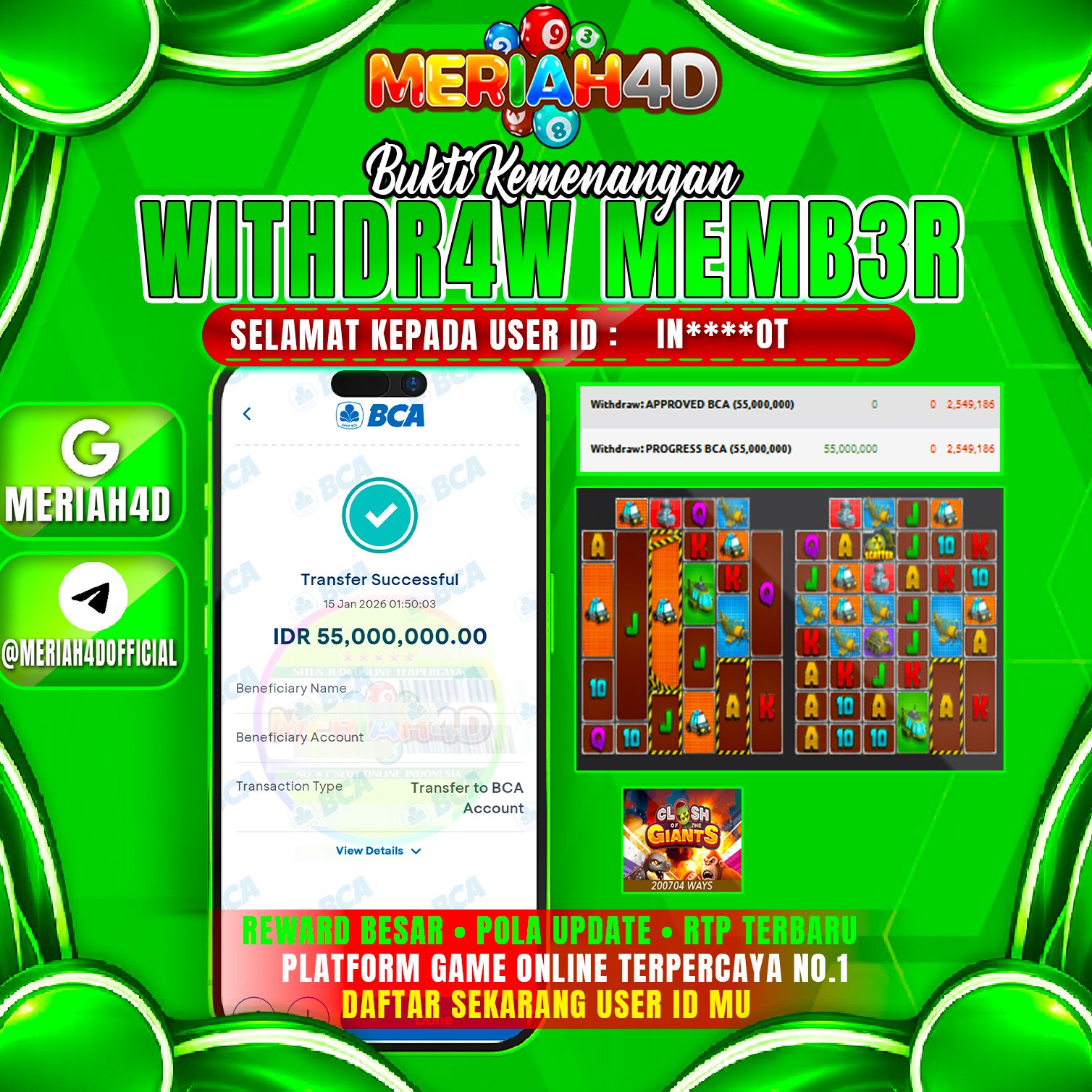 Selamat Kepada ID : IN*******OT Atas Withdraw Rp. 55.000.000 Juta Hari ini. Ditunggu Withdraw Selanjutnya dan ajak juga teman temannya bergabung di Meriah4d