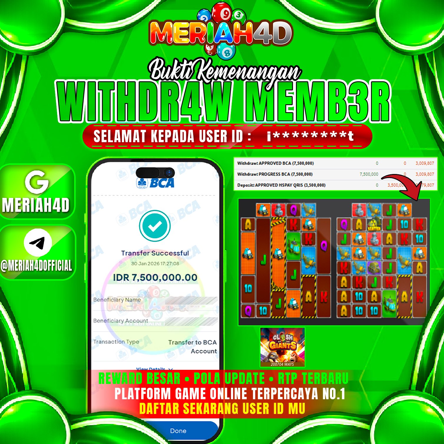 Selamat Kepada ID : IN*****T Atas Withdraw Rp. 7.500.000 Juta Hari ini. Ditunggu Withdraw Selanjutnya dan ajak juga teman temannya bergabung di Meriah4d