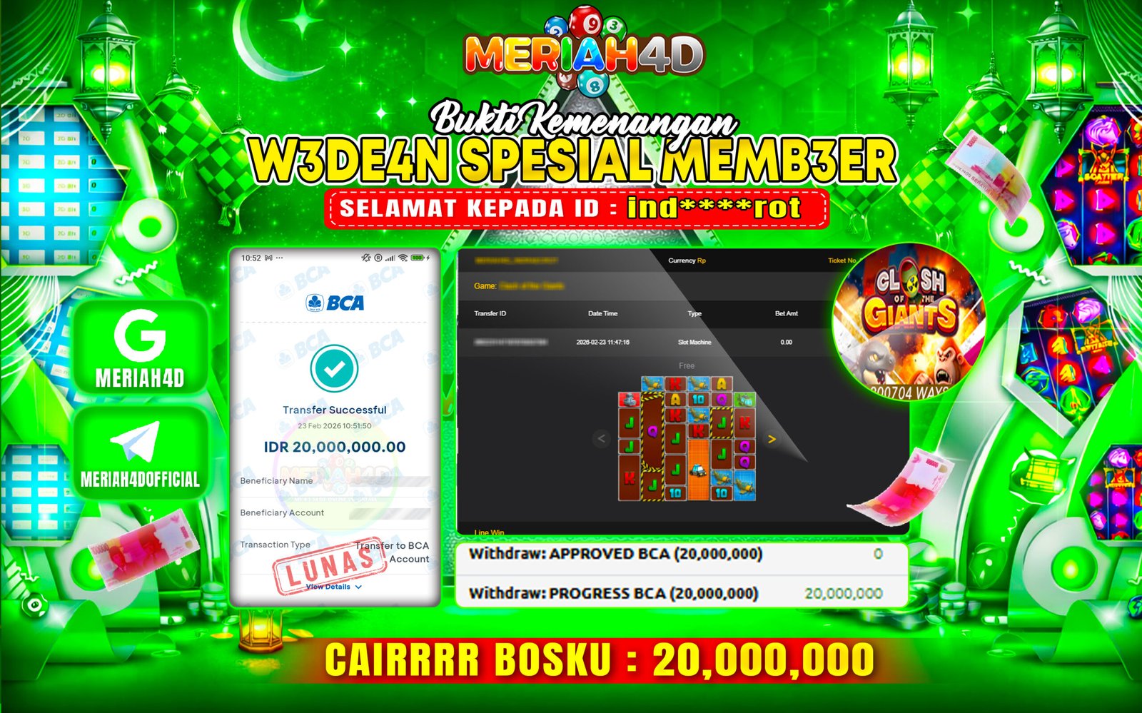 Selamat Kepada ID : IND****ROT Atas Withdraw Rp. 20.000.000 Juta Hari ini. Ditunggu Withdraw Selanjutnya dan ajak juga teman temannya bergabung di Meriah4d