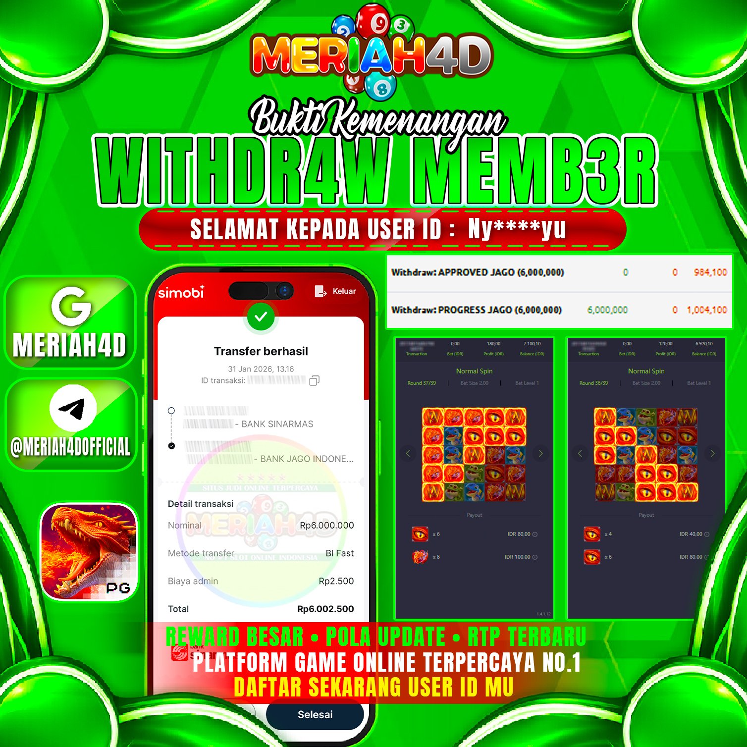 Selamat Kepada ID : NY****YU Atas Withdraw Rp. 6.000.000 Juta Hari ini. Ditunggu Withdraw Selanjutnya dan ajak juga teman temannya bergabung di Meriah4d
