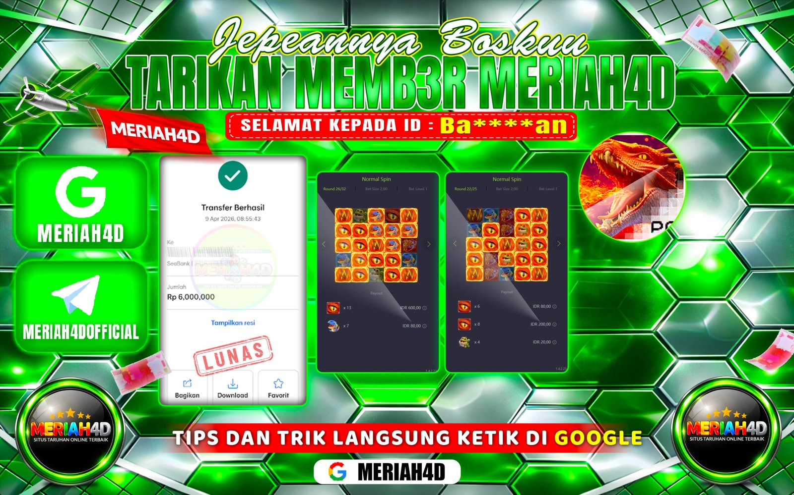 Selamat Kepada ID : Ba****an Atas Withdraw Rp. 6.000.000 Juta Hari ini. Ditunggu Withdraw Selanjutnya dan ajak juga teman temannya bergabung di Meriah4d