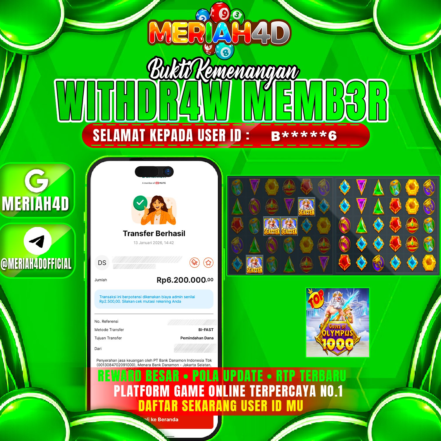 Selamat Kepada ID : B*******6 Atas Withdraw Rp. 6.200.000 Juta Hari ini. Ditunggu Withdraw Selanjutnya dan ajak juga teman temannya bergabung di Meriah4d