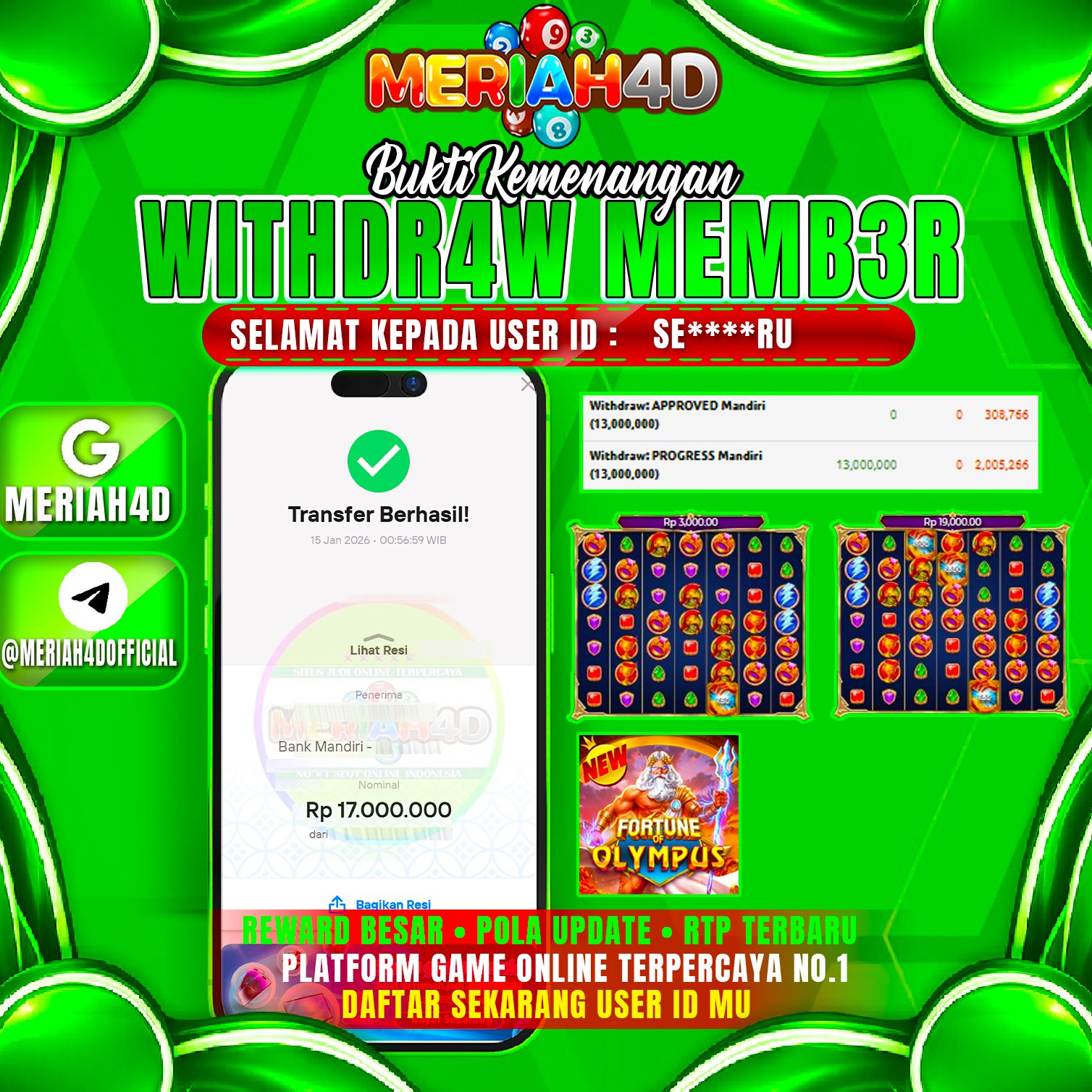 Selamat Kepada ID : SE*******RU Atas Withdraw Rp. 17.000.000 Juta Hari ini. Ditunggu Withdraw Selanjutnya dan ajak juga teman temannya bergabung di Meriah4d