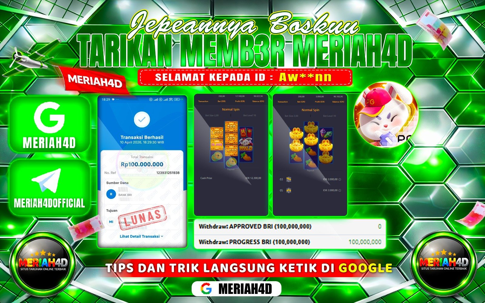 Selamat Kepada ID : Aw**nn Atas Withdraw Rp. 100.000.000 Juta Hari ini. Ditunggu Withdraw Selanjutnya dan ajak juga teman temannya bergabung di Meriah4d