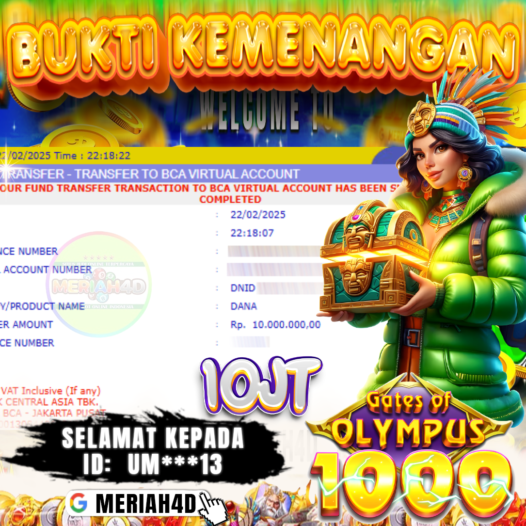 Selamat Kepada ID : U*****13 Atas Withdraw Rp. 10.000.000 Juta Hari ini. Ditunggu Withdraw Selanjutnya dan ajak juga teman temannya bergabung di Meriah4d